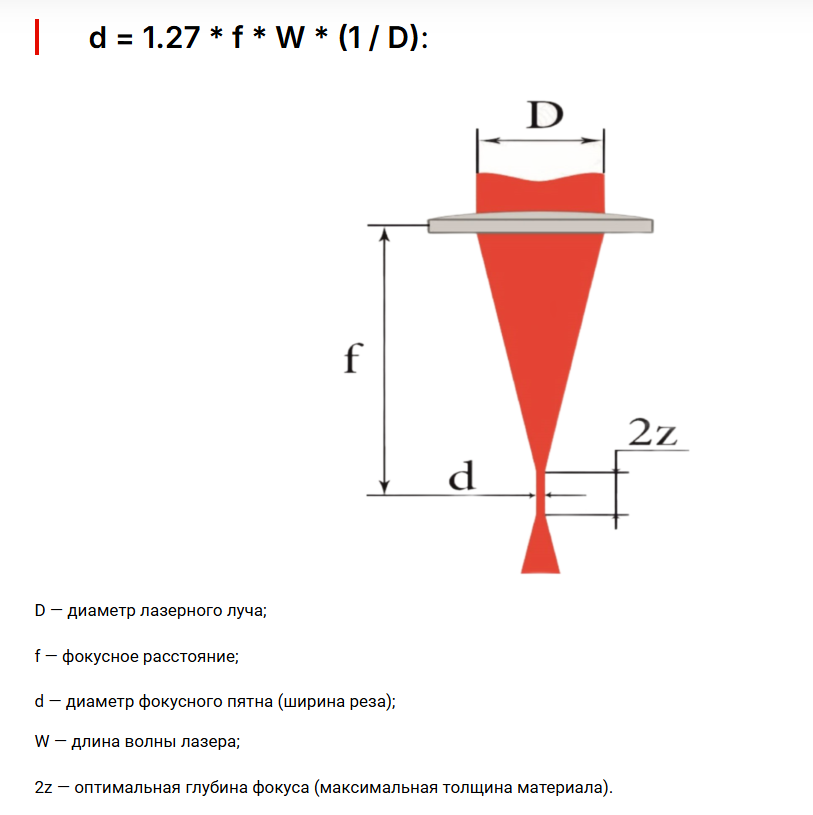 У лазеров, казалось бы, есть целая формула расчёта диаметра пятна в зоне контакта с материалом.