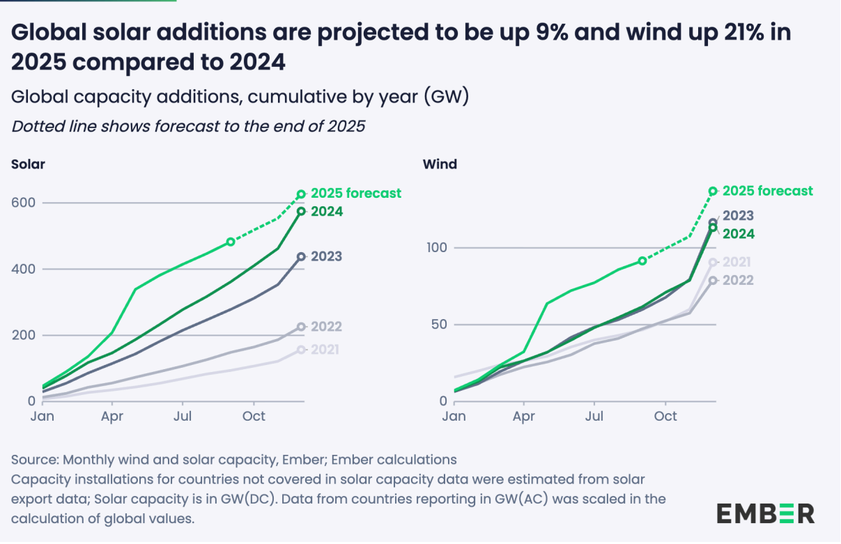 Мощности зеленой генерации продолжают масштабироваться рекордными темпами. Агенство Ember прогнозирует ввод СЭС+ВЭС мощностью 793 ГВт, для сравнения в прошлом году 717 ГВт. Лидером остается Китай, 66% мирового ввода солнечных мощностей и 69% ветрогенерации