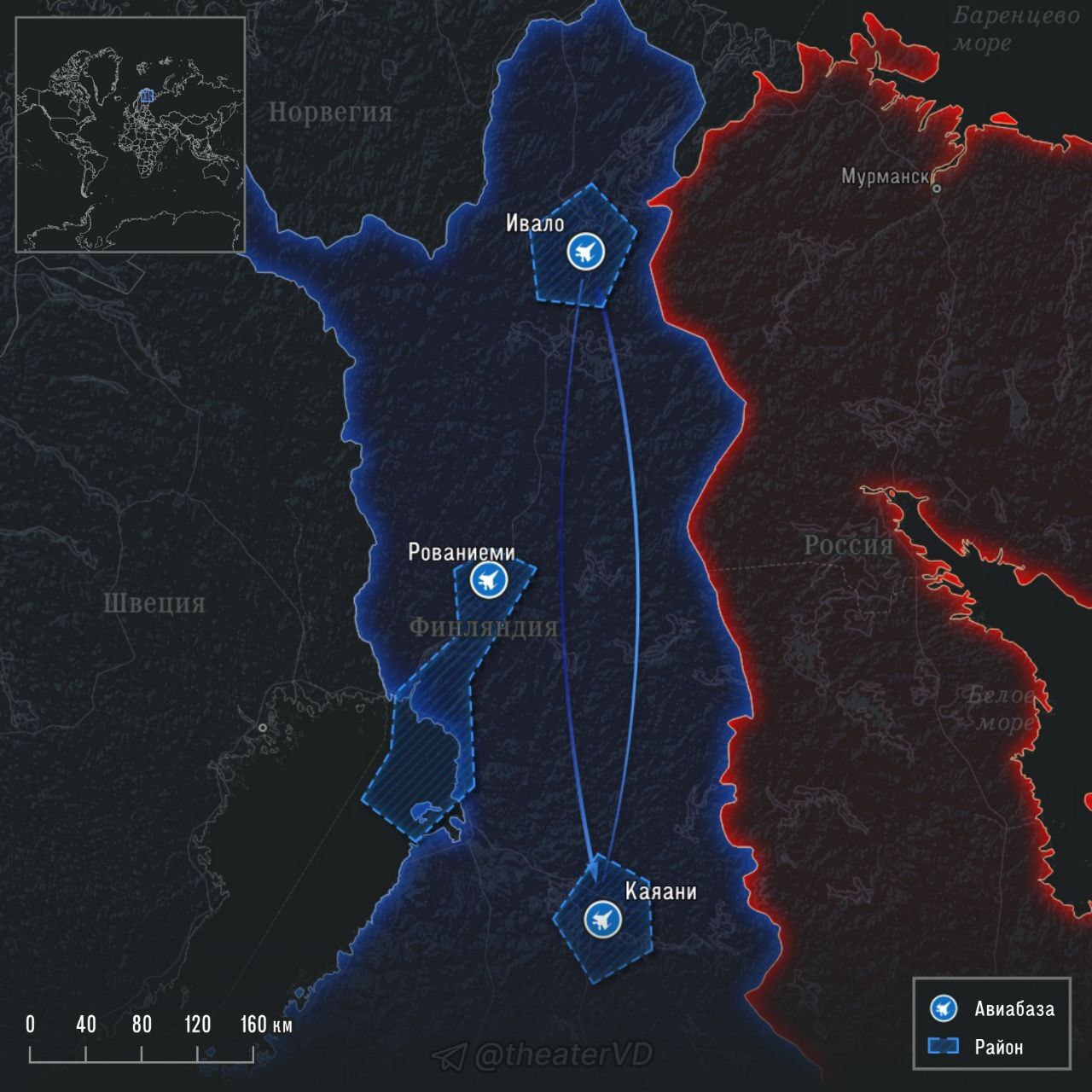 🔷 В рамках учений планируются интенсивные полёты многоцелевых истребителей ✈️ F/A-18 «Хорнет» (Hornet) в воздушном пространстве между Ивало и Каяани, а также над северной частью Ботнического залива.