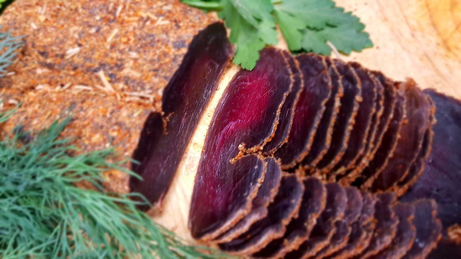 Для подчеркивания истинного мясного аромата, мною создана авторская смесь специй и технология, которая делает мясо нежным и великолепно раскрывает всю гамму оттенков вкуса и запаха. Прошу учесть, что лучше всего вкус деликатеса раскрывается при тончайшей нарезке. По нарезке отдельно напишу несколько нюансов в следующей статье.