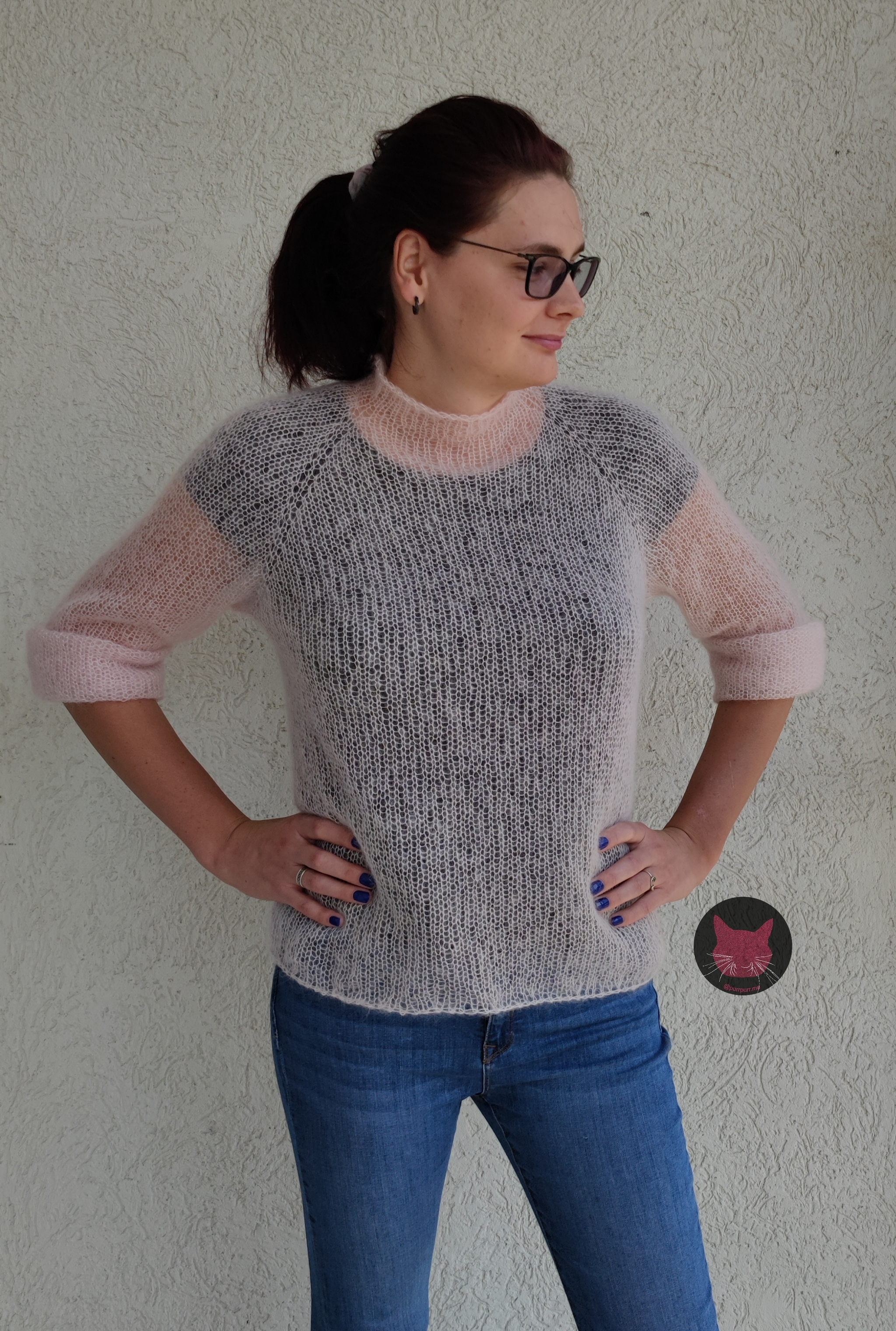 Связана паутинка из моего любимого мохера на шелке, пятёркой, в одну нить. Обожаю бобинные пряжи. Изделие вышло лёгкое и приятное. На мне конечно выглядит не так хорошо, за счёт того, что я больших размеров, а заказчица миниатюрная красотка.