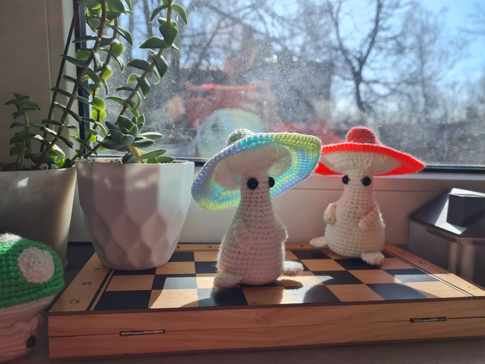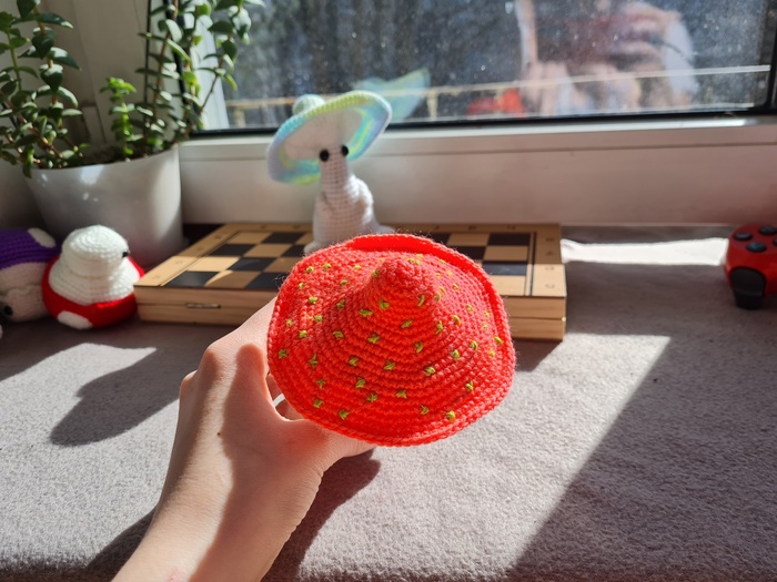 Вязала я таких грибочков из пряжи adelia ivia, а шляпку для цветного грибочка я вязала из пряжи по типу "Пехорка Элитная ", точно написать не смогу, так как этот моточек пряжи мне достался без этикетки.
