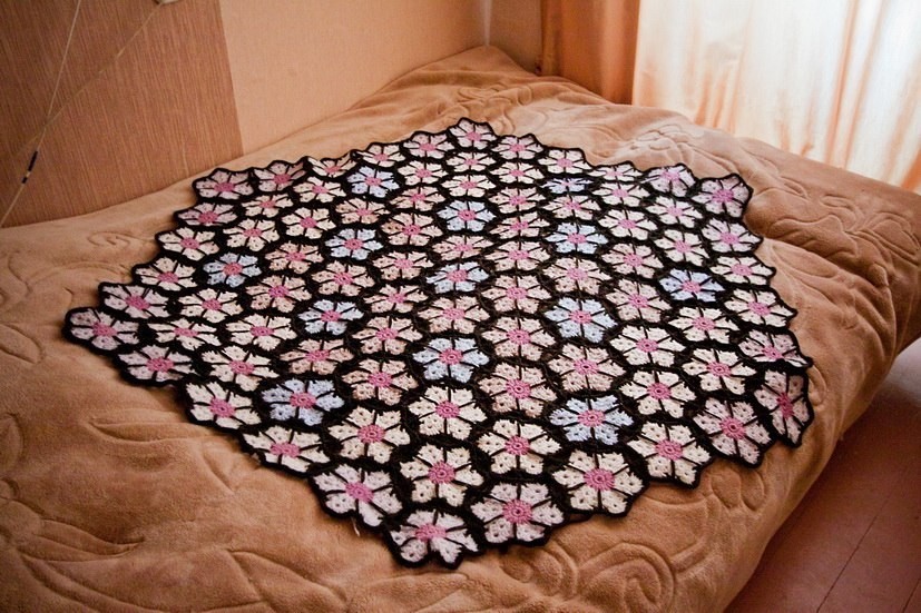 Одеялко вяжется из мотивов - шестиугольников, которые потом соединяются все вместе. Ну, я думаю, уже понятно, где был "затык" - навязать нужное количество шестиугольников. Энтузиазм стал пропадать где-то на двадцатом, далее вязала на упрямстве и с перерывами на другие работы.
