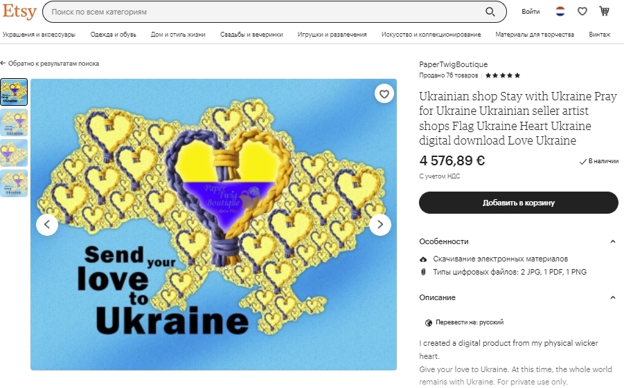 Тем временем, украинские аккаунты, в свойственной им манере, быстро переориентировались и встали в очередь с протянутой рукой, предлагая купить не только новую сувенирку с антироссийской пропагандой, но и просто цифровой контент (отсканированные рисунки, фотографии, арты из фотошопа и т.д.) по завышенным ценам, приговаривая: "Помогите Украине". Цифровой контент нередко берется с просторов Интернет, обрабатывается в фотошопе и выставляется на продажу.