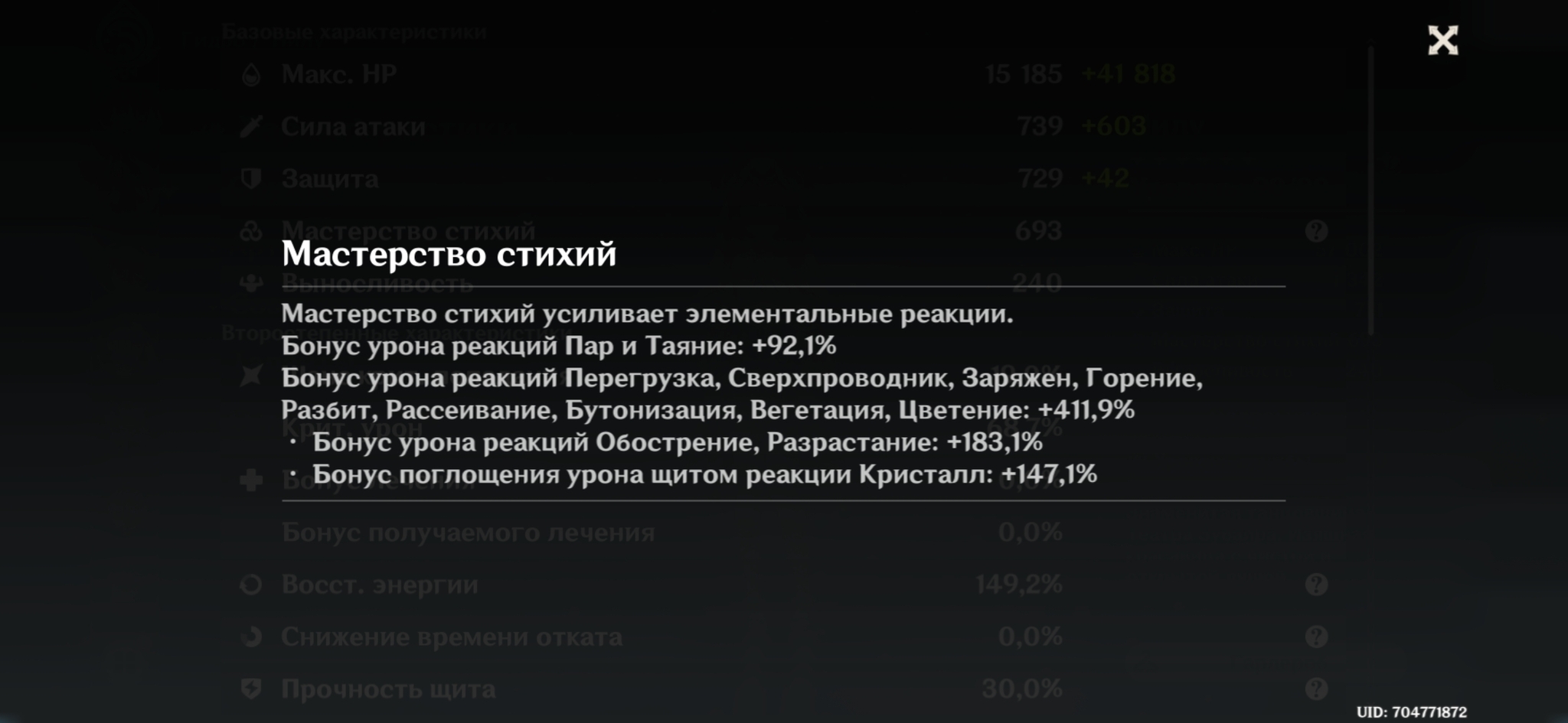 Считаю этот коммент поводом похвастаться своей Нилу, у которой мне накапало дофигища МС в сабстатах) 513 своих, еще 100 от пассивки и 80 от дендро резонанса, итого в бою 693 МС держатся постоянно. Если еще приспичит ее в куполе Нахиды подержать, то там все 943 будут)