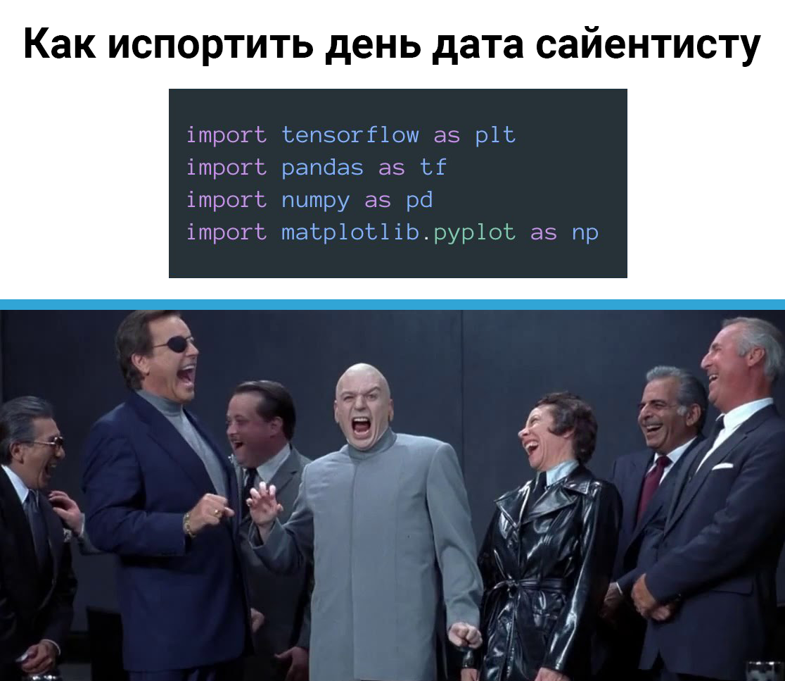 74 tproger.official Типичный программист IT «Вы приняты в Evil Industires» 2 года назад [моё] IT IT юмор Программирование Картинка с текстом Программист Data Science Данные Машинное обучение Доктор Зло 6 3 Ещё 0