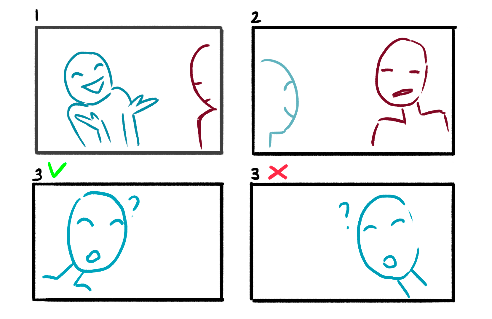 Начнем с диалога. Мы видим двух говорящих персонажей. Одного из них на среднем плане мы показали слева, другого справа. С этого момента они должны оставаться на этих местах, иначе может создасться впечатление что персонажи переместились или еще чего похуже.