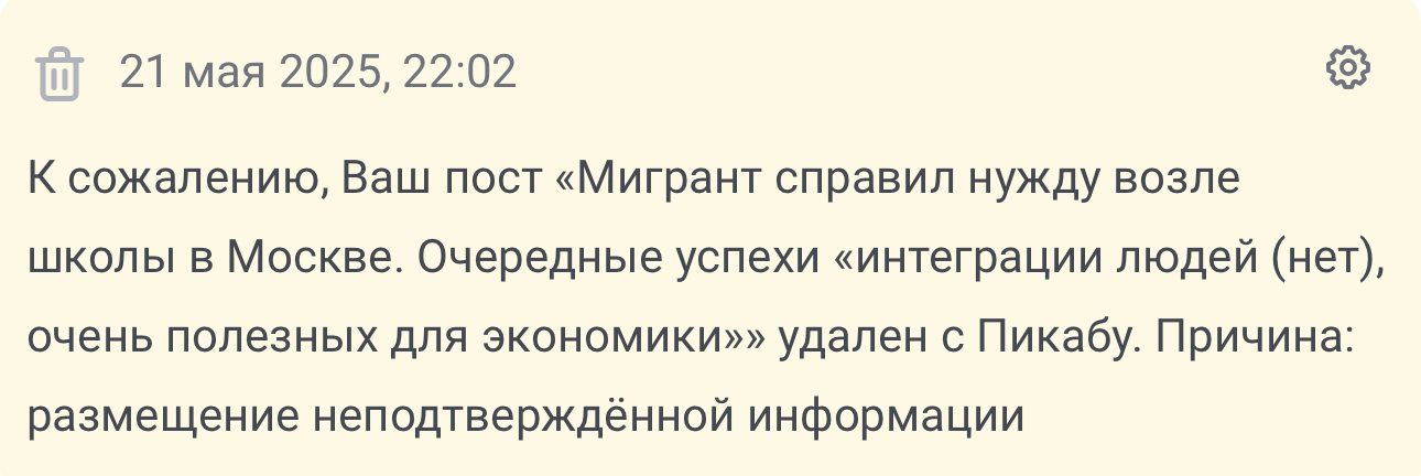 8 Есть официальный ответ AHapxxucT Модерация на Пикабу Вы серьезно??? 7 месяцев назад Размещаю пост с видео, где мигрант среди бела дня мочится в открытую на газон возле школы в ЖК, где я живу (снимал сосед) Браво! С каких пор видео не является доказательством?… Это зашквар, я считаю… Вопросы по модерации Модерация Удаление постов на Пикабу Администрация Мигранты Ещё 0