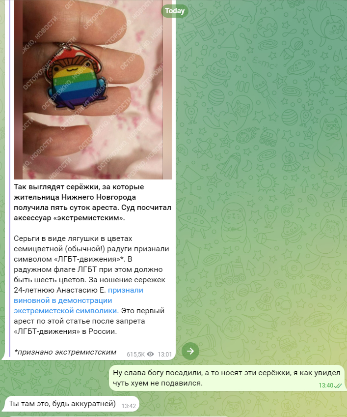 Серьги в виде лягушки в цветах семицветной (обычной!) радуги признали символом «ЛГБТ-движения»*. В радужном флаге ЛГБТ при этом должно быть шесть цветов. За ношение сережек 24-летнюю Анастасию Е. признали виновной в демонстрации экстремистской символики. Это первый арест по этой статье после запрета «ЛГБТ-движения» в России.
