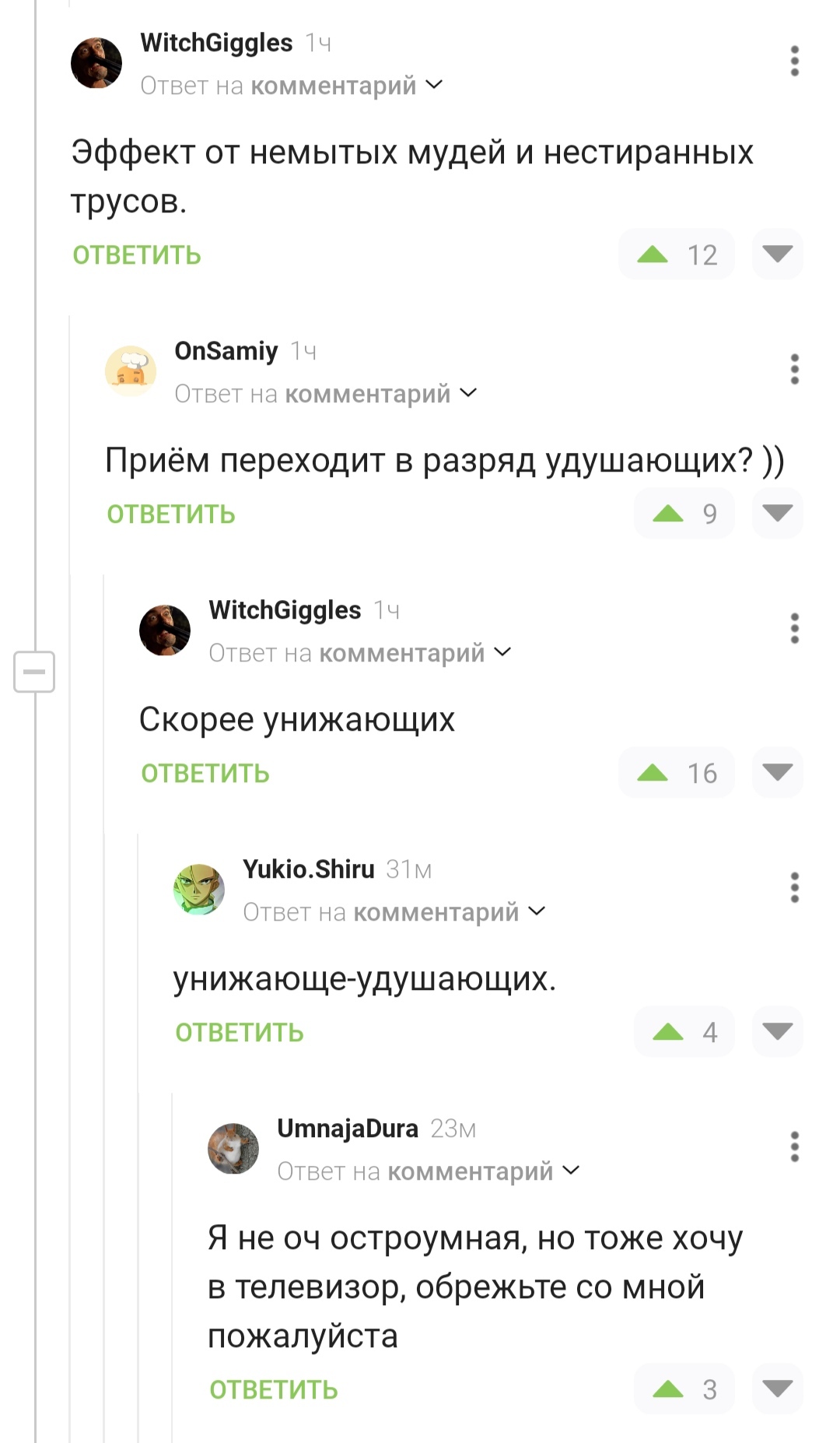 3 RickEnd Вы в телевизоре! 1 год назад @WitchGiggles, @OnSamiy, @Yukio.Shiru, вы в телевизоре! Ну и @UmnajaDura тоже, не будем вас обрезать! Комментарии на Пикабу Кунг-фу Юмор Скриншот Ещё 0