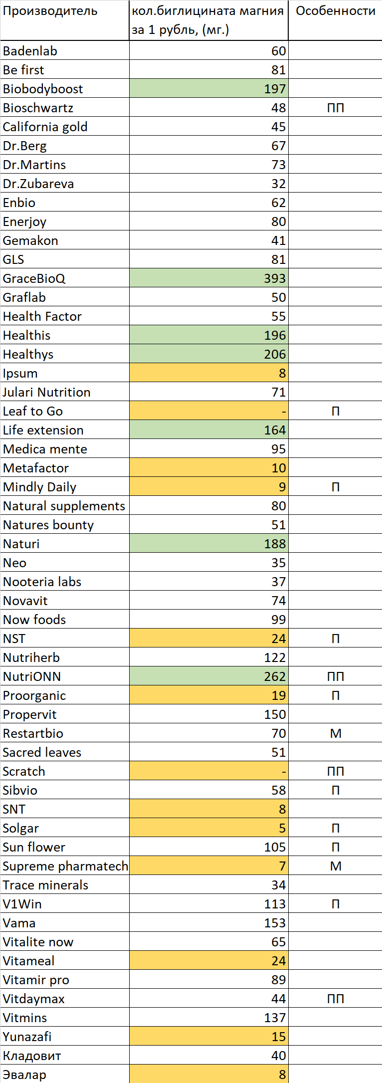 Цель исследования – найти лучших производителей для покупки максимального количества миллиграмм магния за минимальные деньги. И пренебречь их ебучим маркетингом.