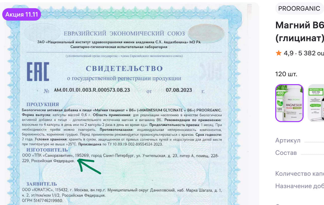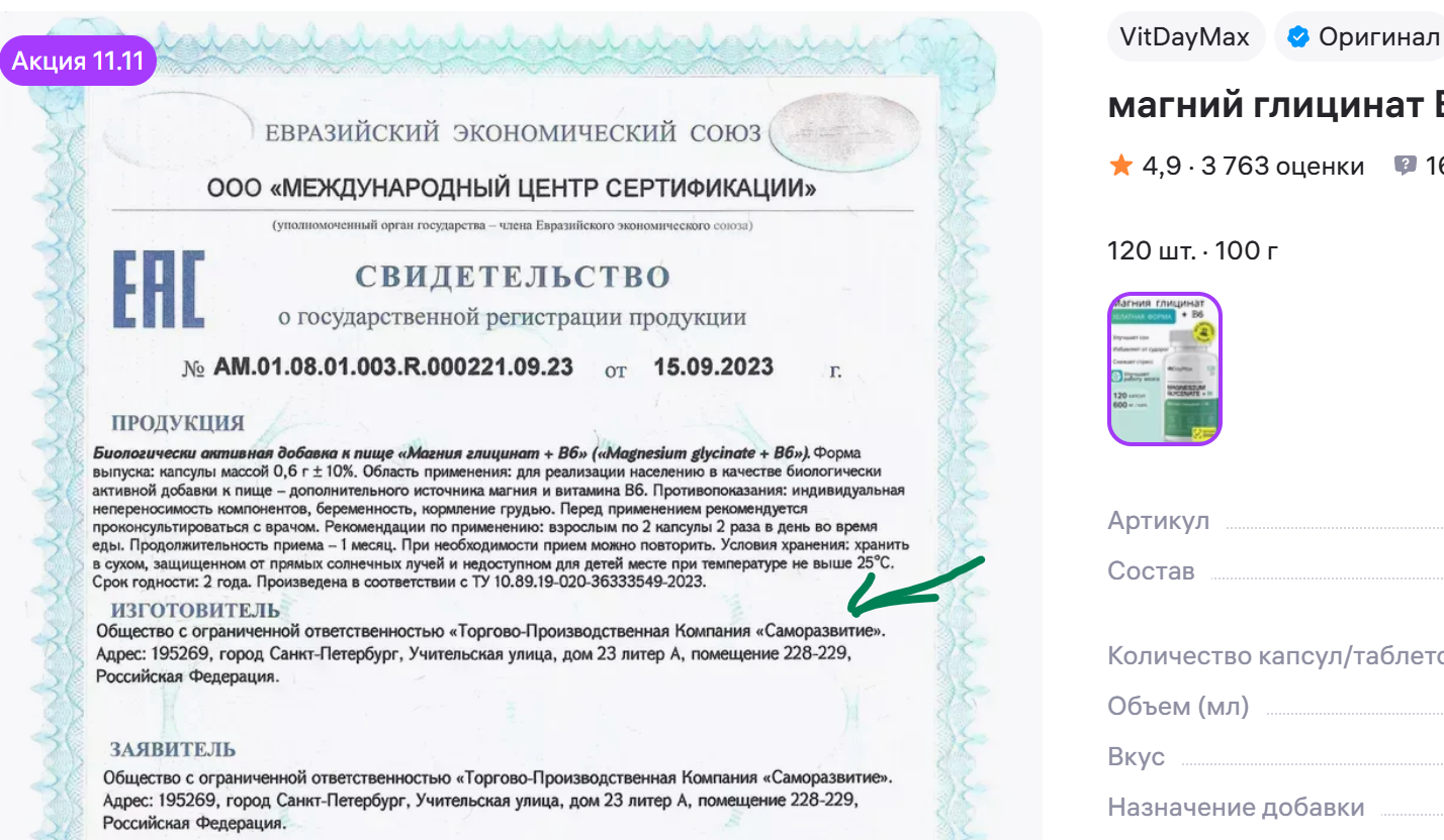 Вот реально, это получилось просто случайно, в процессе написания поста. Сижу, пишу, делаю скриншоты. Для примеров последних взял 2 рандомных производителей из тех вкладок, что были открыты. Дошёл до сертификатов и бля…реально – на ловца и зверь бежит. Мудрость народных пословиц. Смотрите, кто производит VitdayMax:
