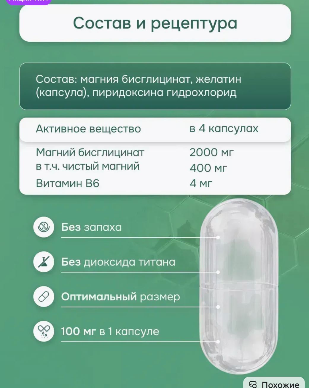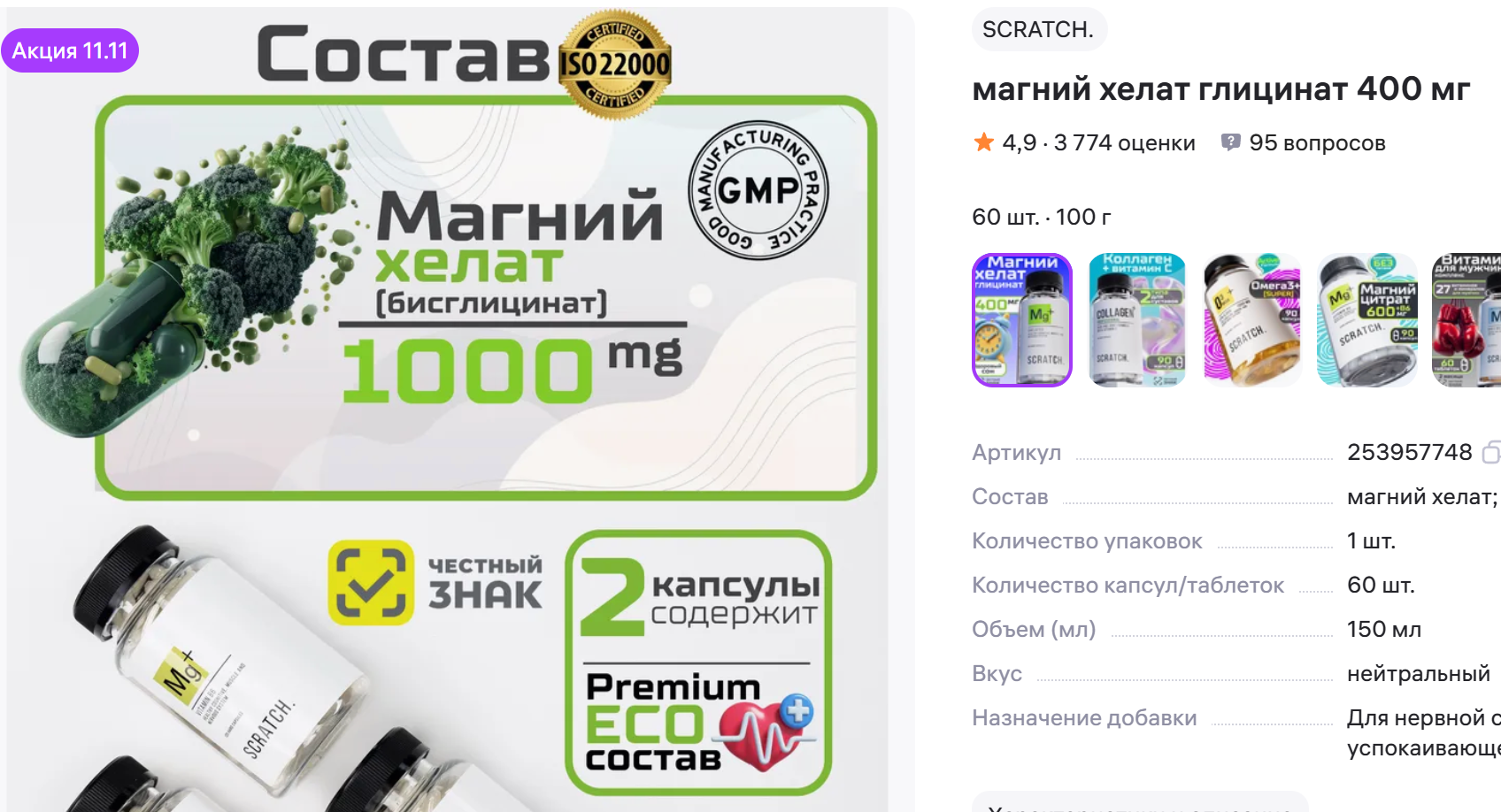 Как считал. Покажу на элементарном примере. Возьмем на ВБ магний хелат от Naturi. Смотрим в состав – бисглицинат - то, что нужно. Суточная доза 1 капсула, считать удобнее и содержание магния указано тоже для одной капсулы. Удобно. И честно. Правда, в нескольких капсулах, растянутых на день, усваивается лучше.