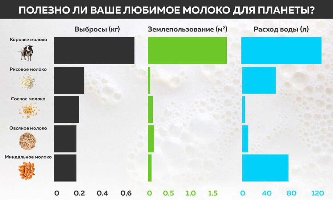 (это условная единица, которую используют для оценки объемов выбросов парниковых газов - прим. ред.), что в 10 раз больше, чем у той же порции соевого молока (156 г CO2-эквивалента), считающегося наиболее питательным заменителем оригинала.