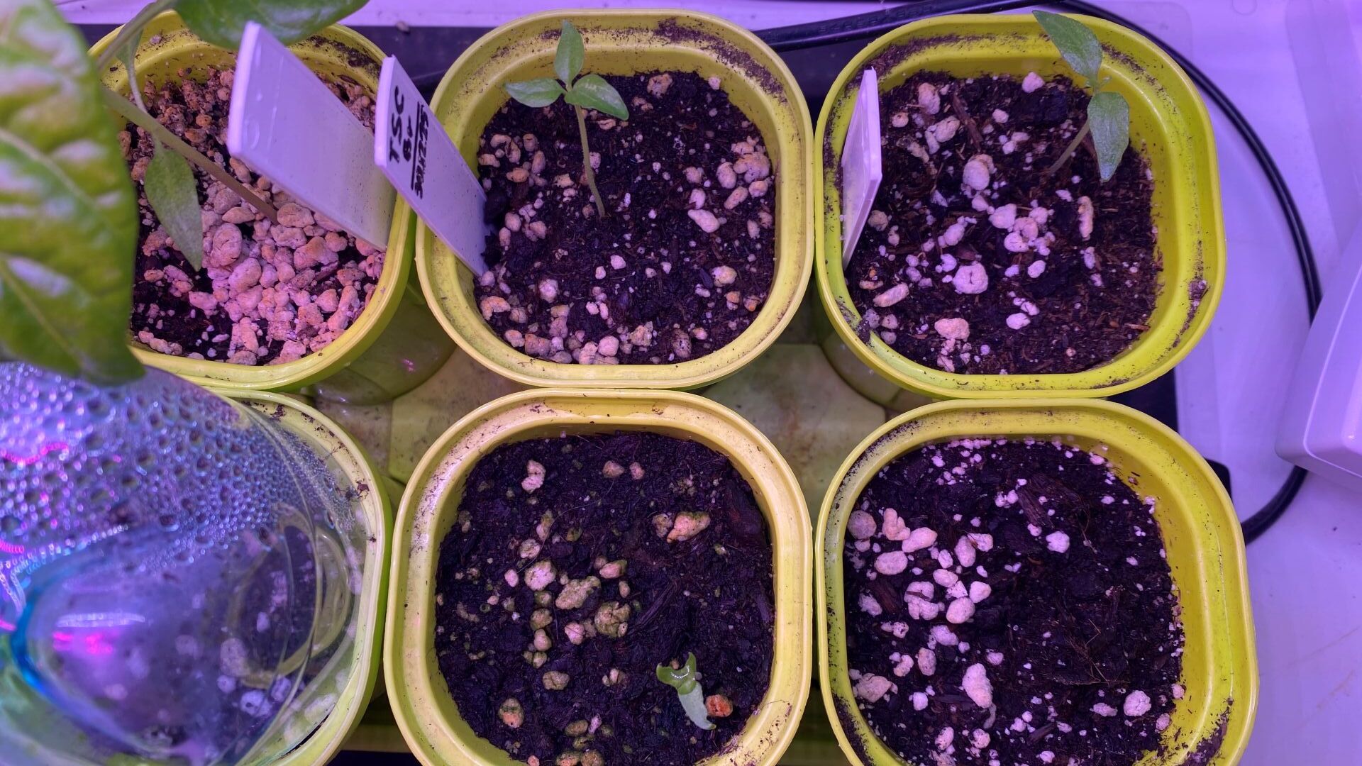 Ну а далее следует член бразильской сборной Шоколадный тринидад скорпион (Trinidad Scorpion Chocolate). Причем обратите внимание на его внешний вид. Нормальный проросток перца вылезает из земли с двумя листиками. А что мы видим тут? Проросли два семечка и оба проростка с тремя (!) листиками.