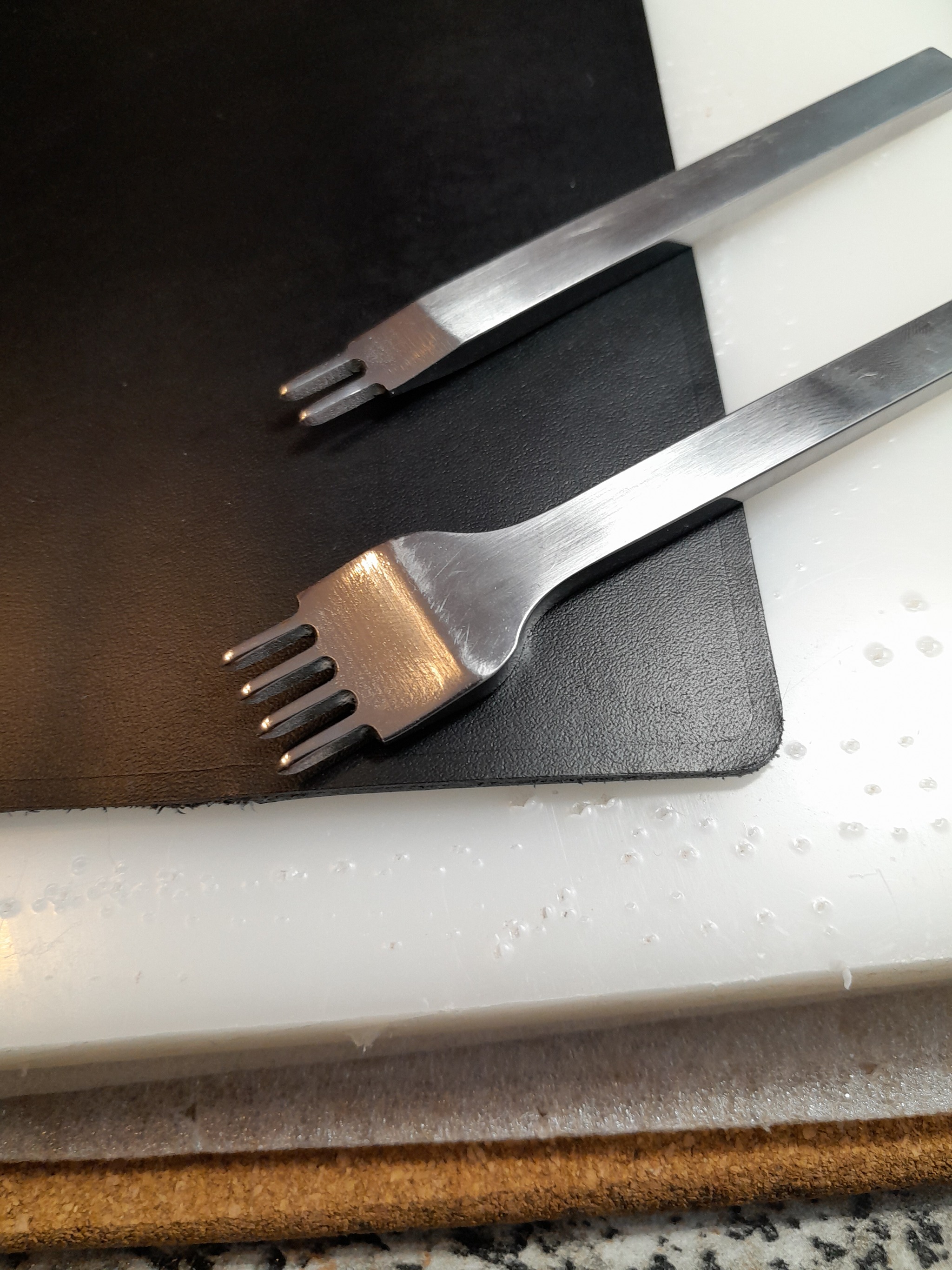 Пробойники. Я использую ромбы с шагом 4 мм, как самый универсальный размер - и для кошельков хорошо и сумку можно пробить и ремень. Ромбы удобны для позиционирования по линии пробоя. Но по пробойникам для начинающих это только моё мнение. Пробиваем