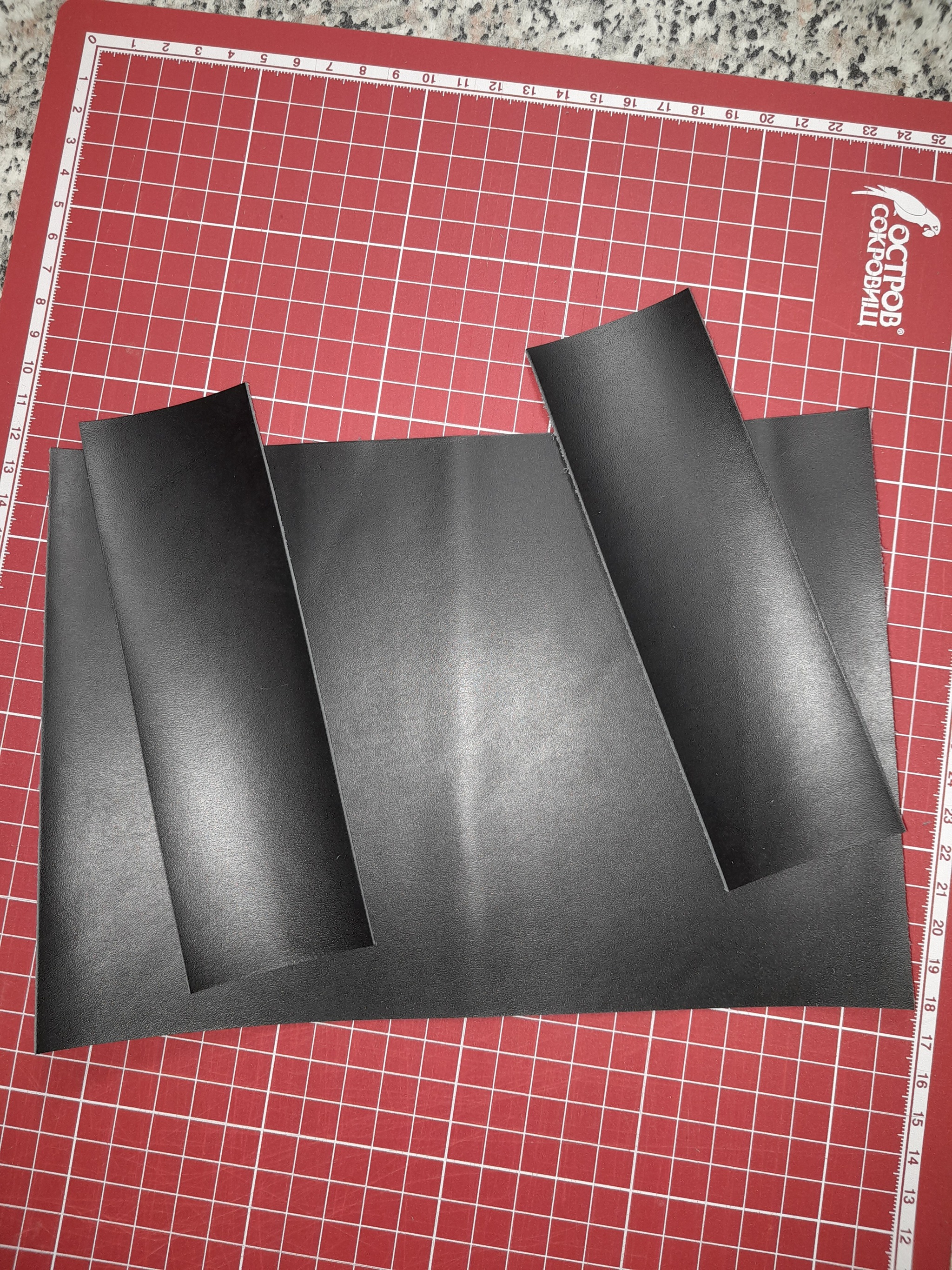 Олфа с лезвием 18 мм. Линейка металлическая и мат для резки, лучше всего пятислойный, не меньше, чем А3, лучше А2. Кстати, мат, это то, на чьём фоне и фотографируется все это. Очень удобен для раскроя прямоугольников. Так что вырезали с помощью этого инструмента 3 прямоугольника