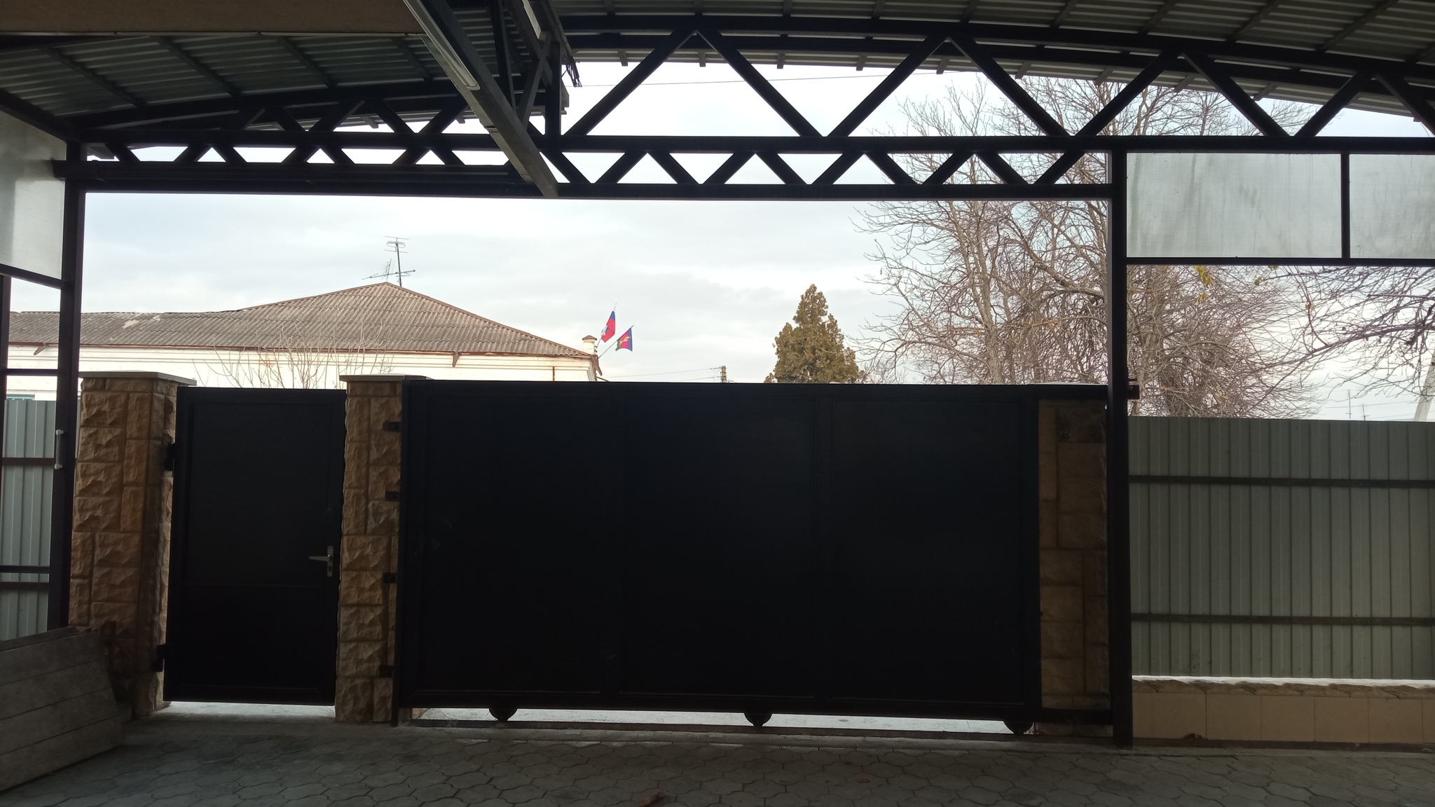 Парусность будет приличная - ширина проёма 5 метров. Ветровая нагрузка периодически очень сильная. Зашивать буду штакетником, чтобы парусность поубавить.