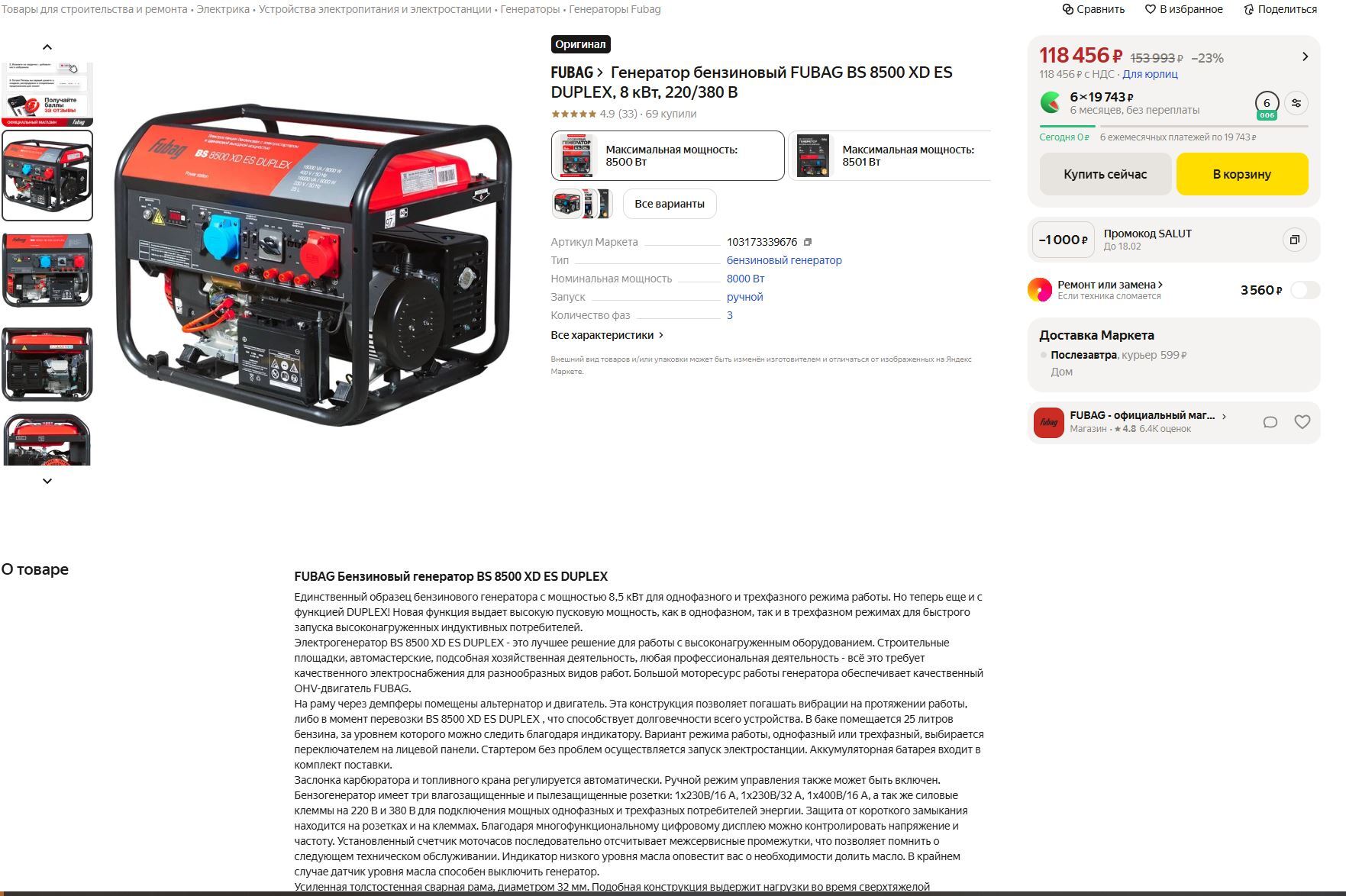 Максимальная мощность 8500 Вт