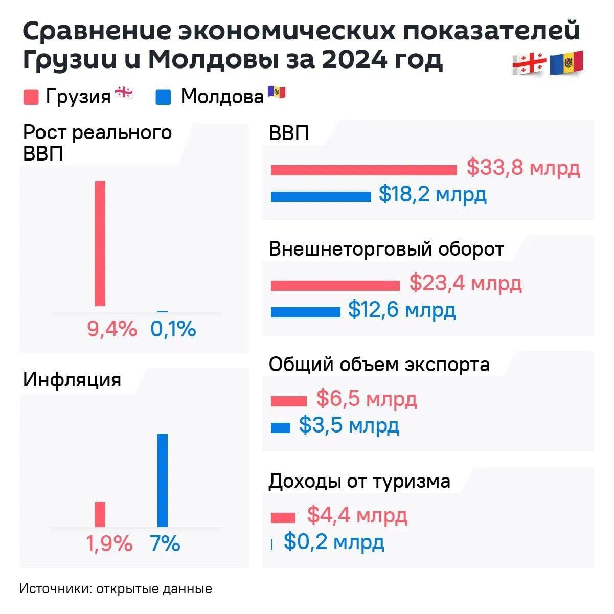 Экономика Грузии за прошлый год растёт (+9,4% ВВП), тогда как в Молдове спад (−0,1%), да и инфляция была меньше: 1,9 против 7%.