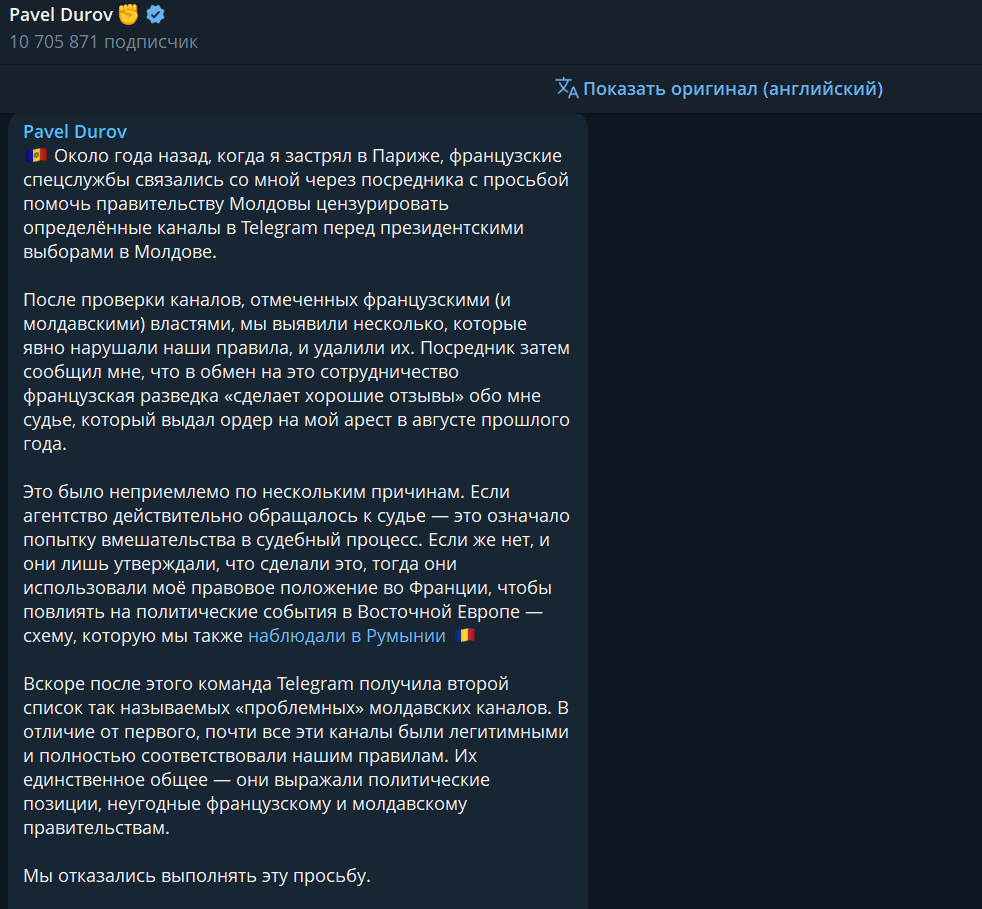 Вчера Дуров заявил, что Франция просила его удалить оппозиционные молдавские каналы: