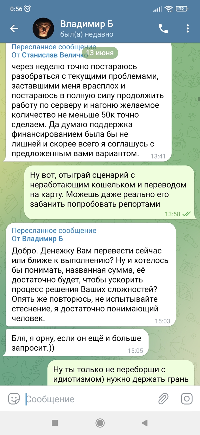 После чего Владимир стал так же вежливо подталкивать его к мысли, что готов отправить ещё больше денег, если это ускорит начало работы. “Какой сладенький немамонт попался”, - мелькнуло в голове у разводилы, потому что он отреагировал и продолжил переписку.