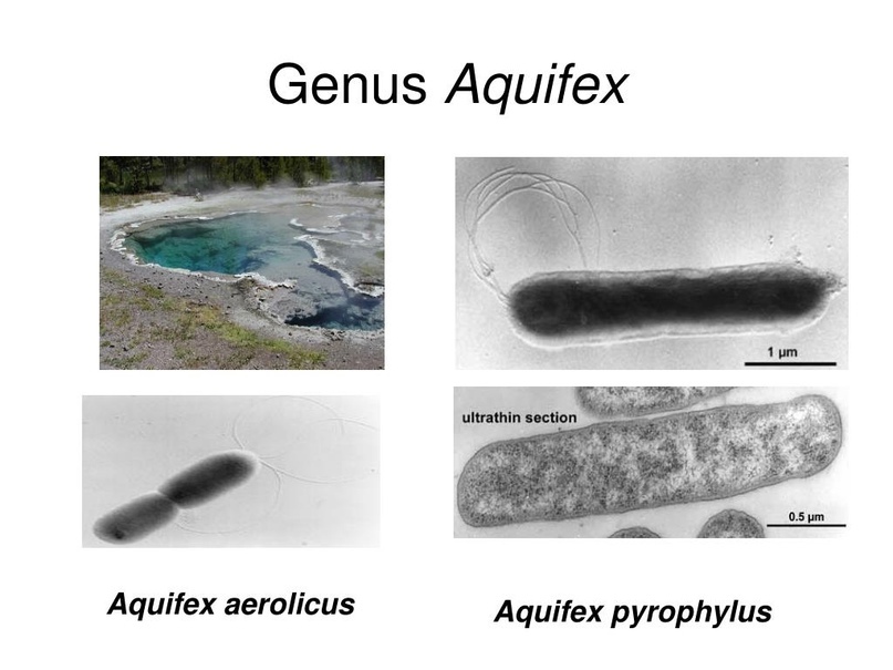 Вид Aquifex представляет бактерии, которые способны жить и размножаться в подводных вулканах и в горячих источниках при температурах до +95°С. Более того, эти удивительные микроорганизмы еще и аэробы, то есть для синтеза энергии они нуждаются в кислороде, хотя способны выживать и при довольно низкой концентрации кислорода.