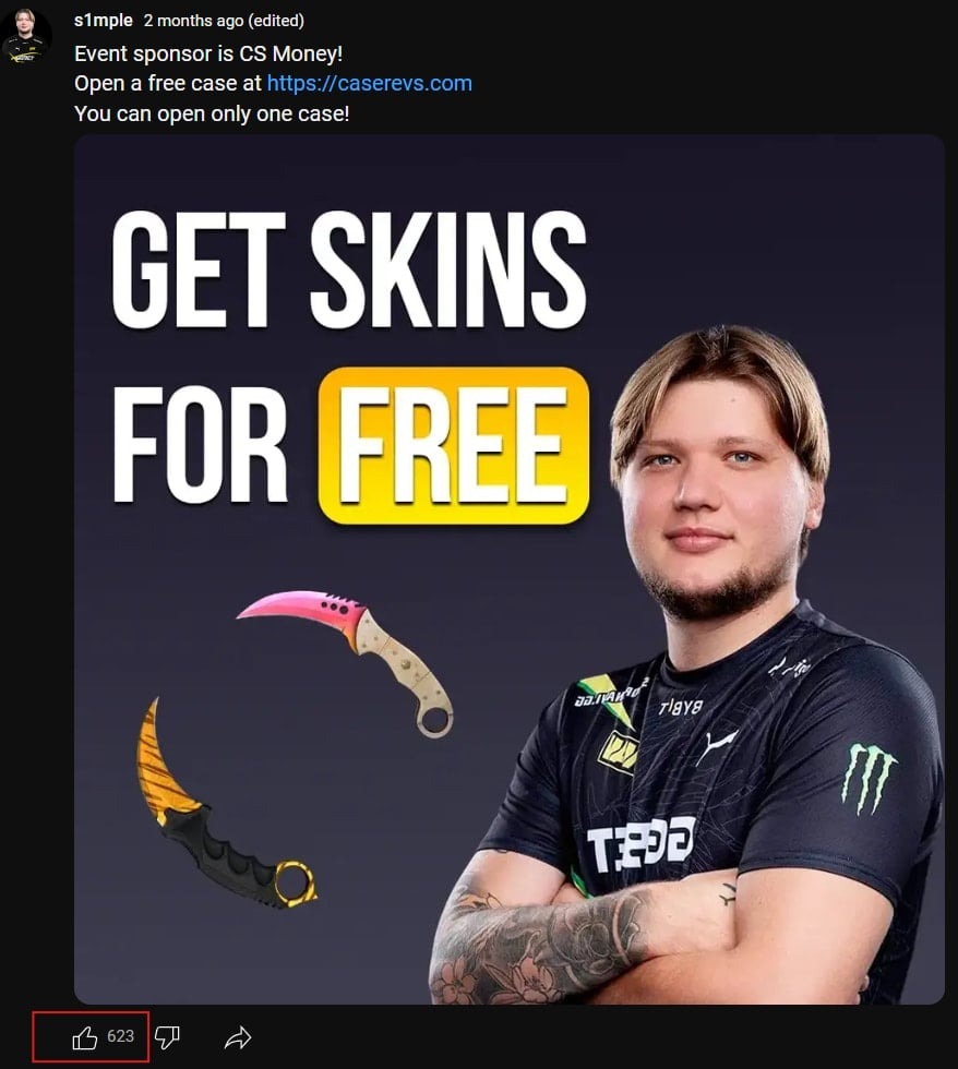 Пользователю показывается сайт с предложением халявных скинов или кейсов от имени Navi (известной киберспортивной команды).