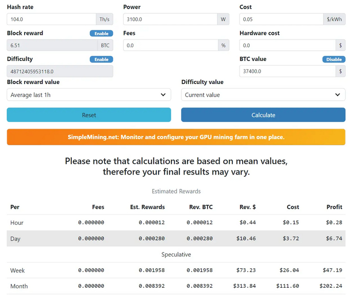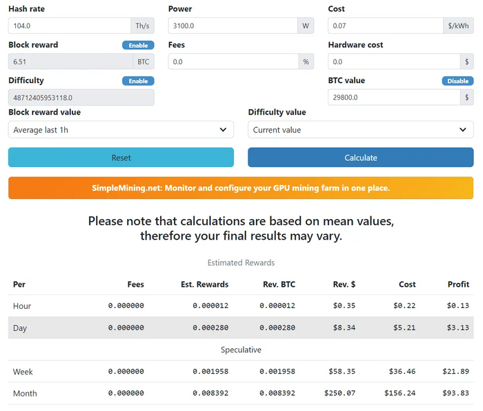 Сейчас такая же модель асика (Bitmain Antminer S19J Pro 104 Th/s) стоит 135000р ≈1700 USD. При курсе BTC = 29800 USD и стоимости электроэнергии 0,07 USD за кВт-ч, ASIC приносит около 3 USD в сутки или 94 USD в месяц (уже с учетом расходов). Таким образом, на данный момент срок окупаемости составляет 1,5 года.