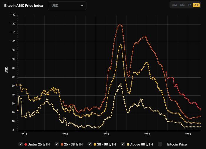 Давайте более подробно рассмотрим, выгодно ли майнить именно на ASIC-майнерах. Они простые, доступные и экономически оправданные. Посмотрев на график стоимости асиков с начала 2022 до начала 2023 года, легко понять, насколько сильно упали цены.