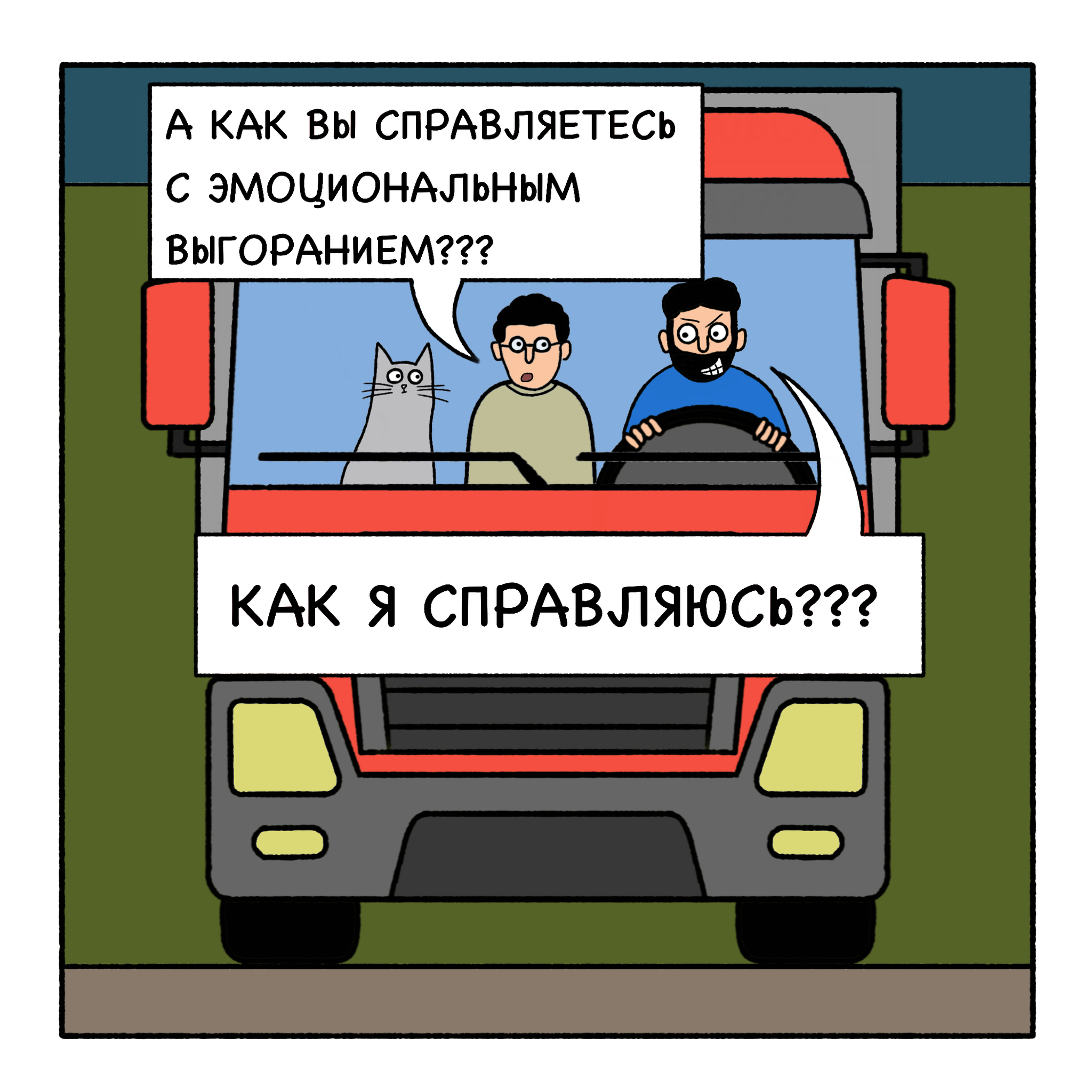 Кот Вулкан и дальнобой едут далеко-далеко. В дороге дальнобоя развлекает очень эрудированный и умный кот Вулкан.
