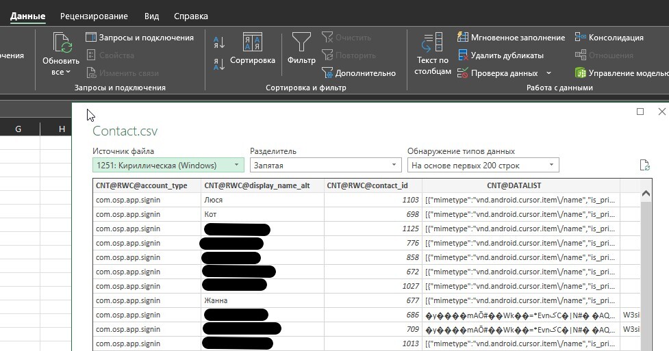 А дальше пошло дерьмо. Я попытался загрузить эти файлы в Google Контакты и оказалось, что имена контактов он видит нормально, а собственно номера телефонов - ну, короче как-то так)