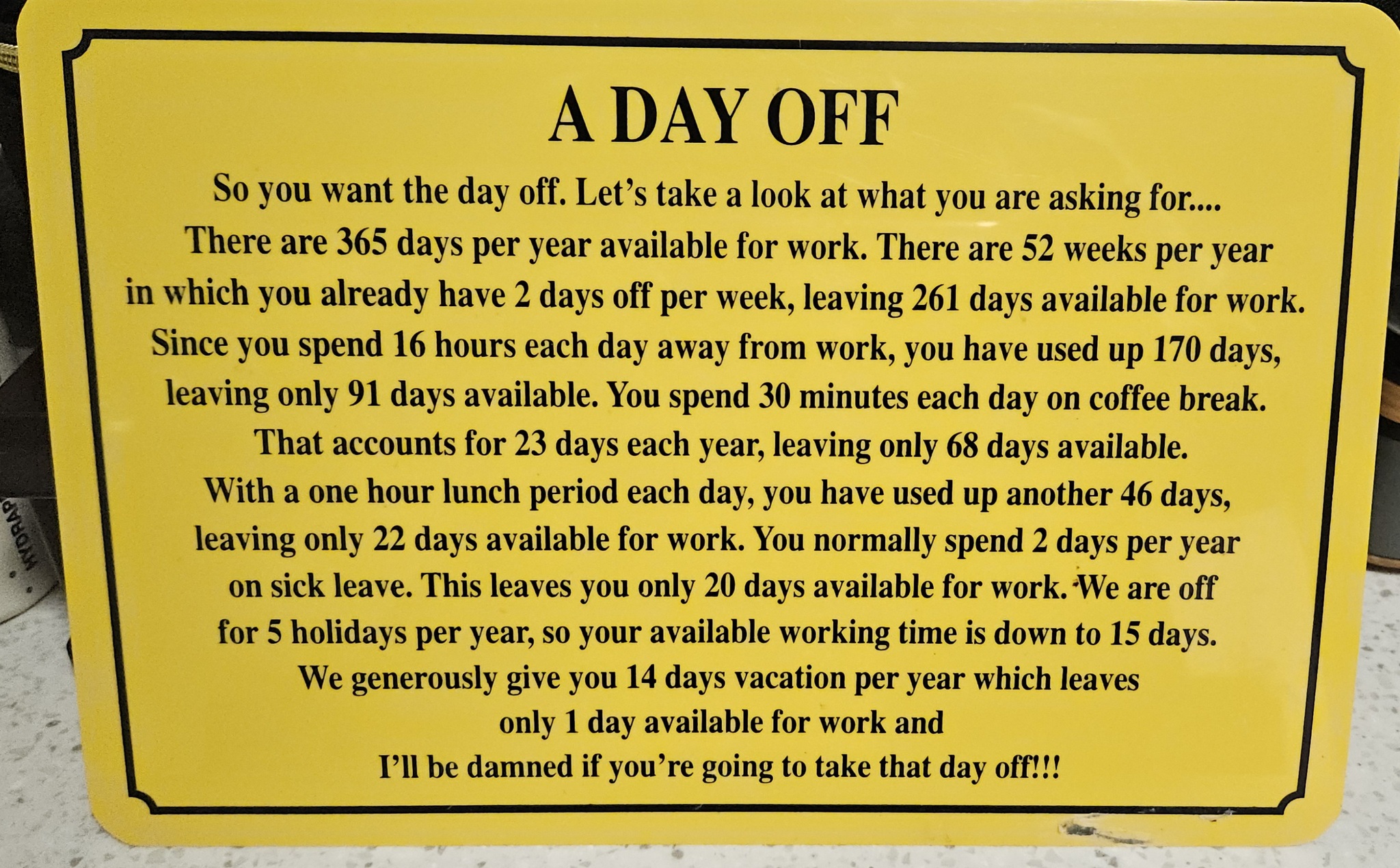 Мы щедро предоставляем вам 14 дней отпуска в год, из которых для работы остается только 1 день, и будь я проклят, если вы возьмете этот день выходным!!