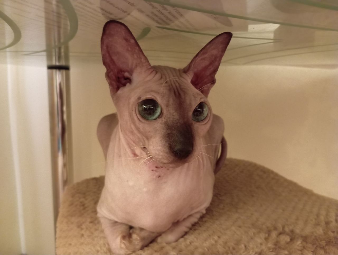 Если он давно бомжует, то его состояние понятно. Ушной клещ жуткий и проблемы с кожей. А если это самвыгульный сфинкс, то наверно таких хозяев искать не надо.🤔