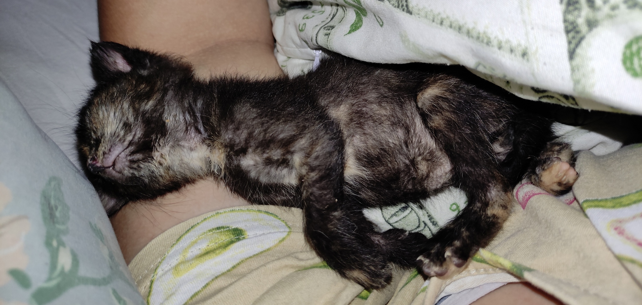 Самый маленький, какой-то облезлый и страшный котенок. Был найден первым, совсем немощным, поэтому ему я полноценно заменила маму. Ей меня и считает. Оставлю его себе, так как на такого страшненького врядли кто позарится, а эта девочка очень ласковая и нежная, привязана уже ко мне.