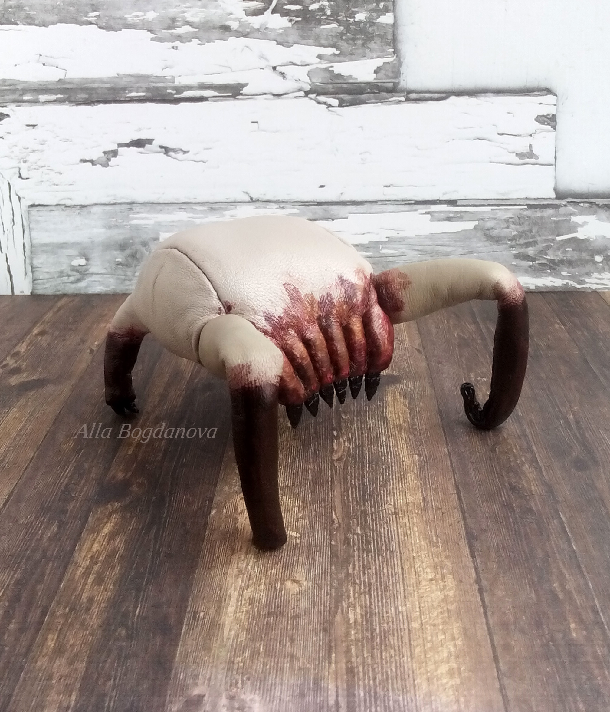 Выкройка без припусков на швы, я добавляла по 2-3 мм по всем срезам при выкраивании кожи. Для «пасти» в нижней части туловища которая, я выкраивала просто прямоугольник 11,5*3,5 см, сшивала в кольцо, одну сторону пришивала к донышку, а другую потом стянула ниткой. В лапки ставила проволочный каркас. Перед набивкой наполнителем я увлажняла кожу хорошенько, чтобы она приняла нужную форму. Расписывала акриловыми красками.