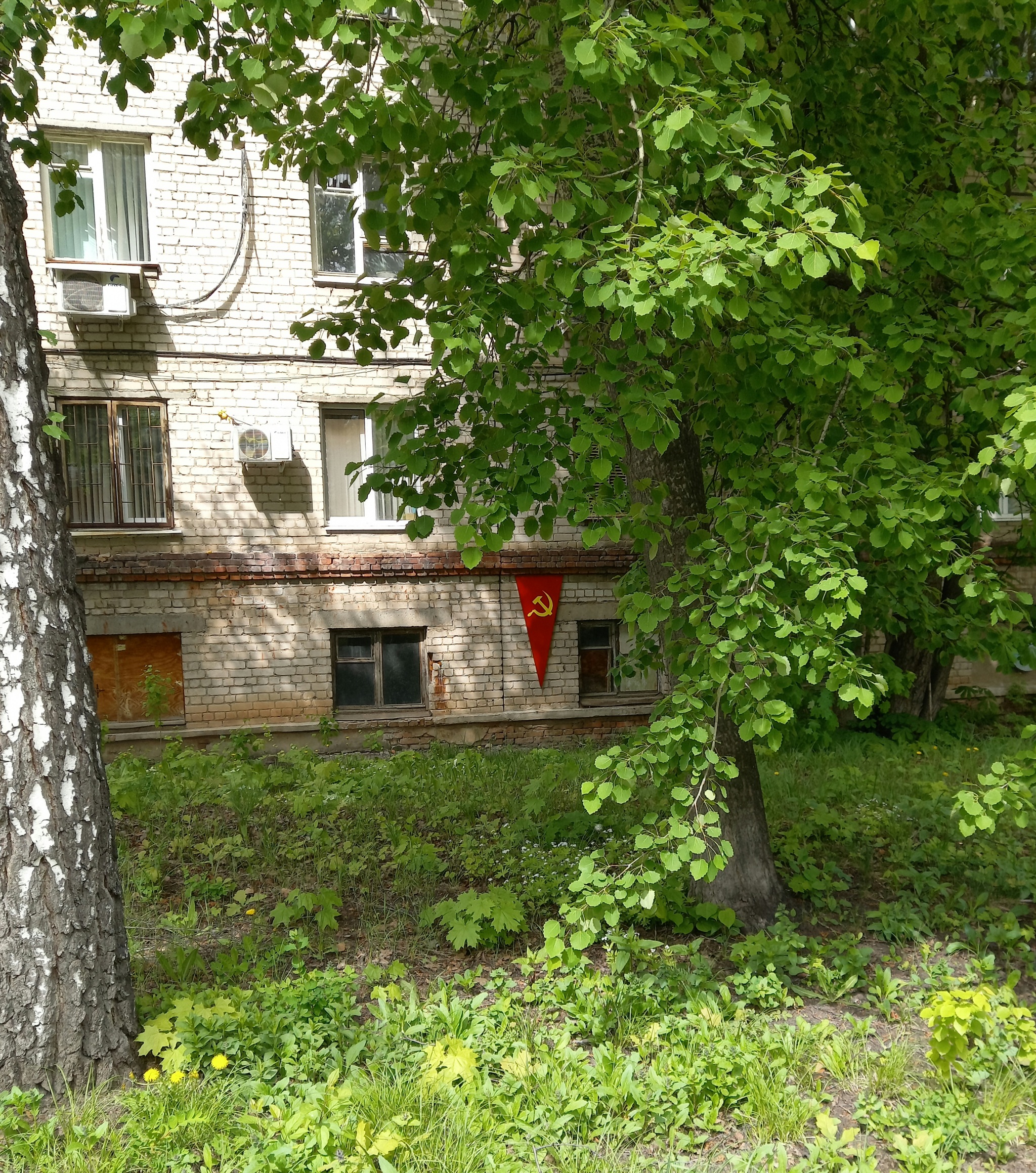 На корпусе завода советских времен, где фирма, в которой работаю, снимает помещение, висит старый ржавый вымпел. Точнее уже не старый и не ржавый. Ещё в прошлом году собирались обновить, но руки дошли только сейчас. Собрались с ребятами, и вот результат.