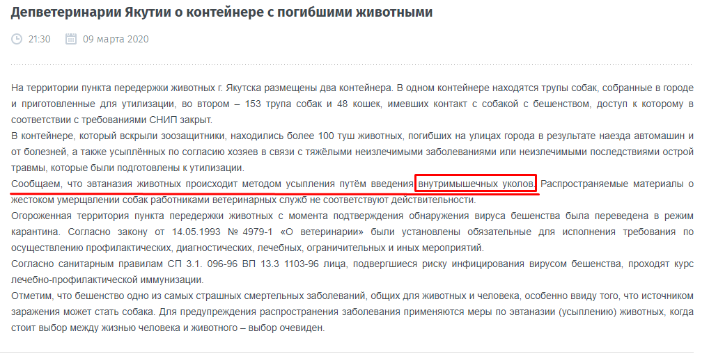 В источнике выше говорится о внутримышечных уколах. Наркоз в мышцу не ставят. В мышцу вводят курареподобные средства для "усыпления". Вы, действительно, считаете, что питомник, который даже не удосужился поставить прививки от бешенства, будет помещать под наркоз животных перед умерщвлением? Даже в частном секторе пока ветеренара не попросишь о предварительном наркозе, он о нем и не вспомнит, и сам не предложит.