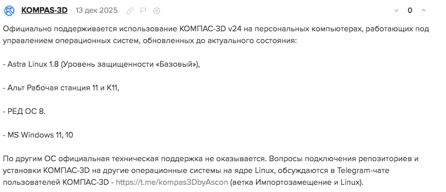 По другим ОС заявили, что вопросы подключения репозиториев и установки КОМПАС-3D на другие операционные системы на ядре Linux, обсуждаются в Telegram-чате пользователей КОМПАС-3D - https://t.me/kompas3DbyAscon (ветка Импортозамещение и Linux).