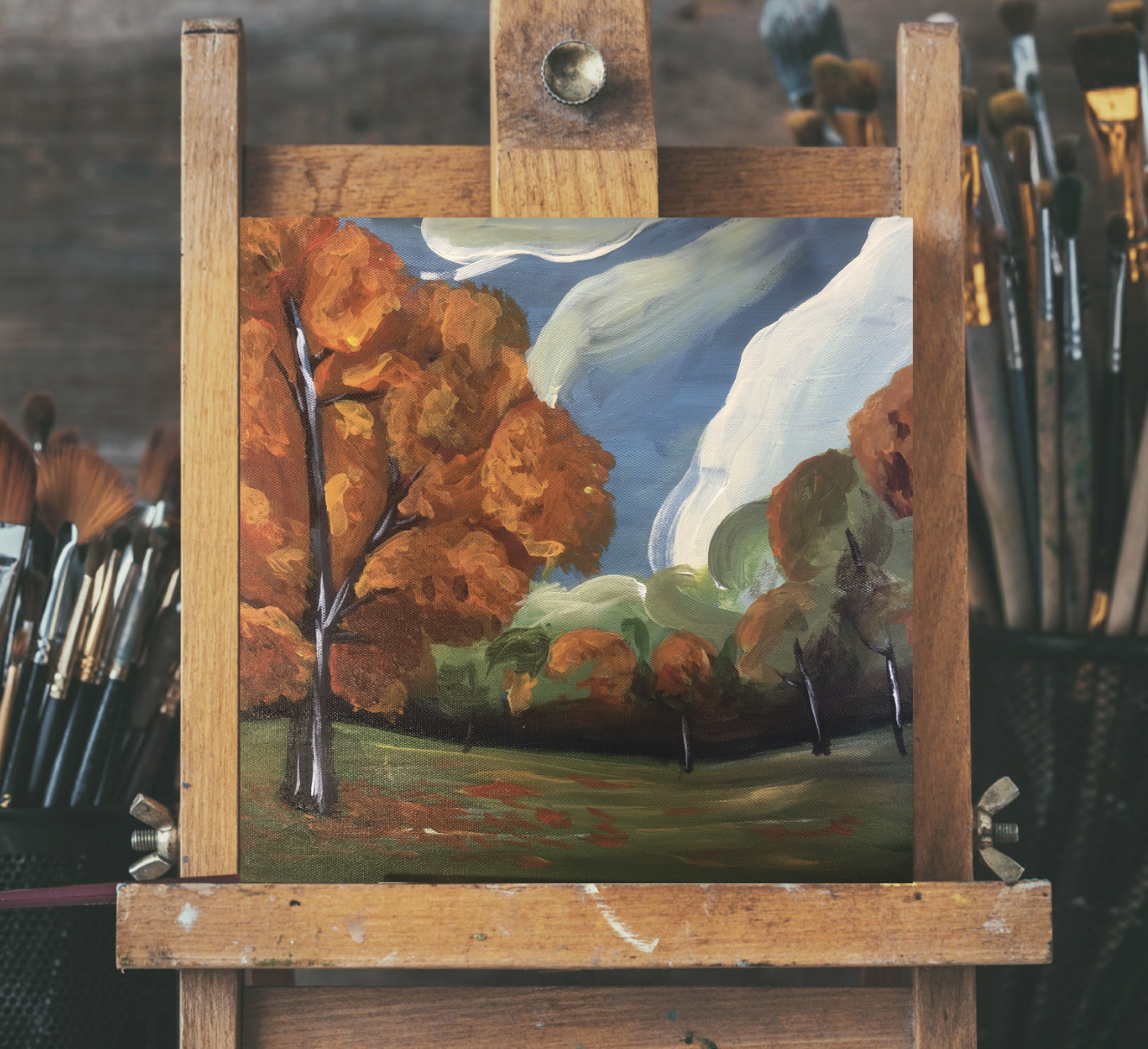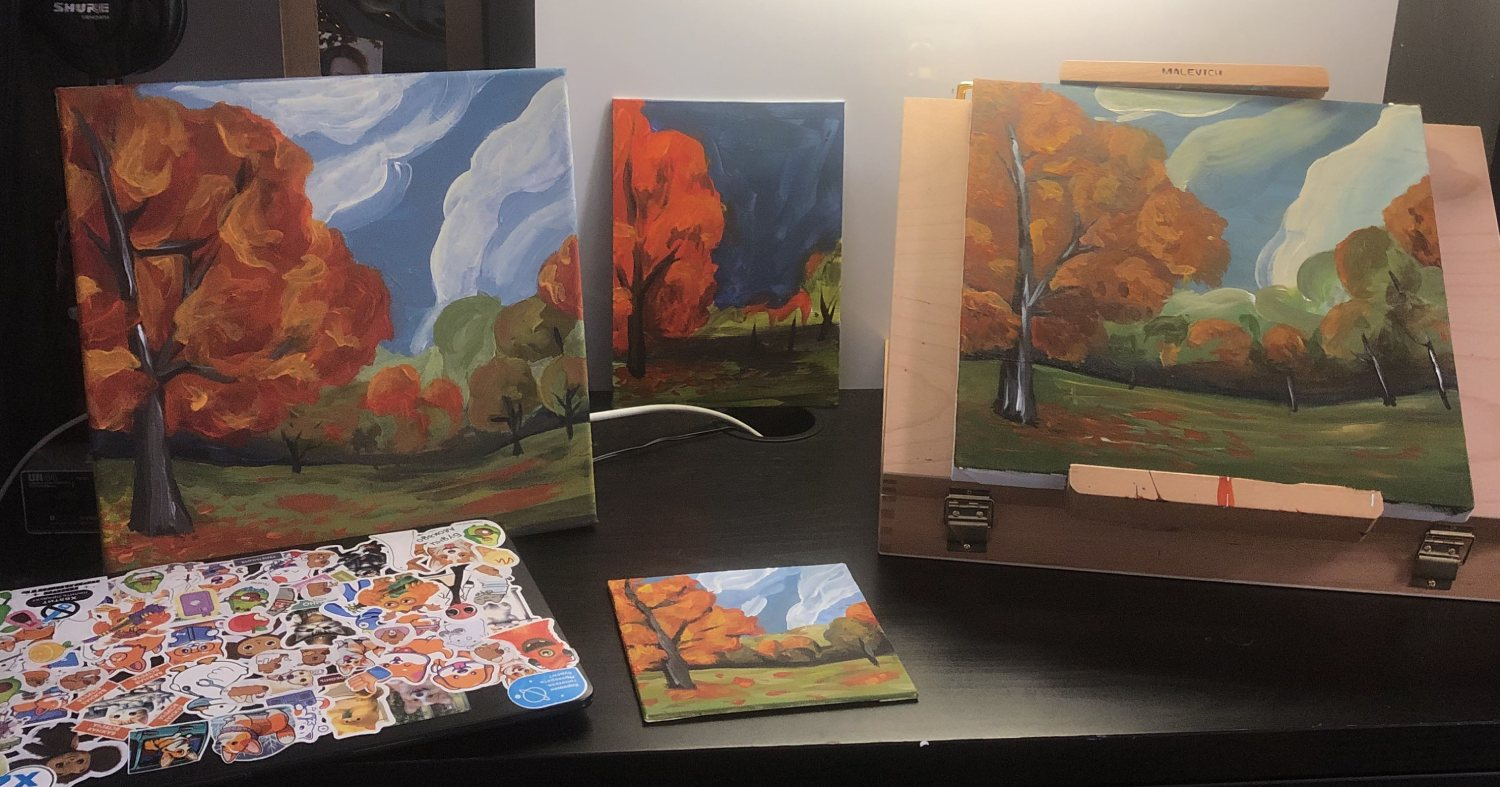 Помимо музыки как таковой, в альбоме важное место занимает оформление. Будучи по основной работе связанным с IT и ИИ в частности, я очень грустно смотрю на засилие технологий в искусстве. Мне захотелось сделать что-то еще более аналоговое, мне хотелось передать запах дерева и краски. И я написал картину на тему осеннего леса (хотя уже очень давно не рисовал, а акрил и вовсе два раза в жизни в руках держал).