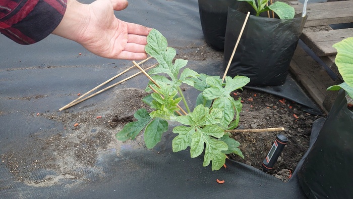 29 апреля. Пришло время высаживать гигантский арбуз, который я выращиваю для конкурса на самый большой арбуз - https://aminosil.ru/fest_melon2024. Признаюсь, в этом случае я немного считерил. Я не выращивал рассаду арбуза и уж тем более не занимался прививкой арбуза. Я просто взял и забрал пару готовых к высадке кустов у Владимира Луканина. Он один из соорганизаторов данного конкурса, агротехнолог и просто любитель больших арбузов.
