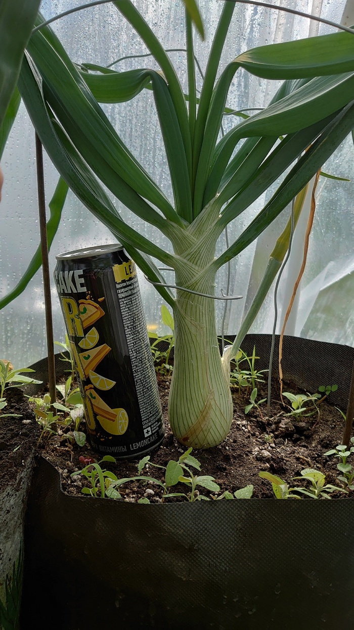 Гигантский лук за последнее время заметно похорошел. Вот фото сделанное 5го мая, в самом толстом месте окружность луковицы 19 см. Сегодня она уже 20см+