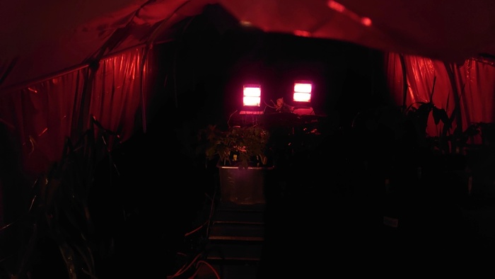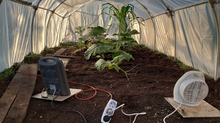 Но случилось так, что погода резко ухудшилась, солнце ушло и пошел снег, а по ночам стабильно минусовая температура. Поэтому мной было принято решение увеличить мощность обогрева. У каждой тыквы стоит тепловой вентилятор на 2000 ватт и инфракрасный обогреватель на 600 ватт.