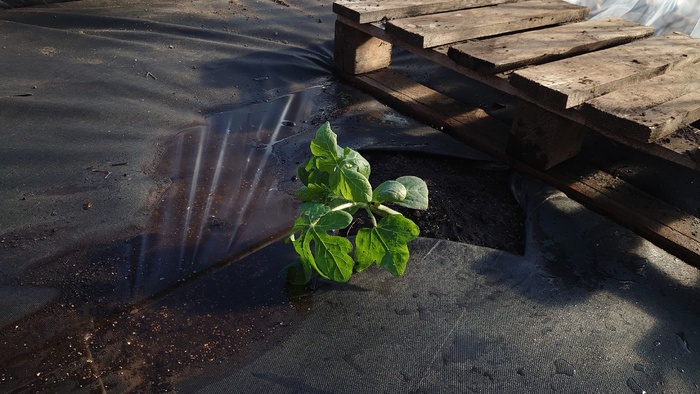 Хоть гигантский арбуз формируется по принципу гигантской тыквы, но укоренять его междоузлия не надо, а значит, чтобы не мешали сорняки, можно покрыть всю землю геотекстилем.