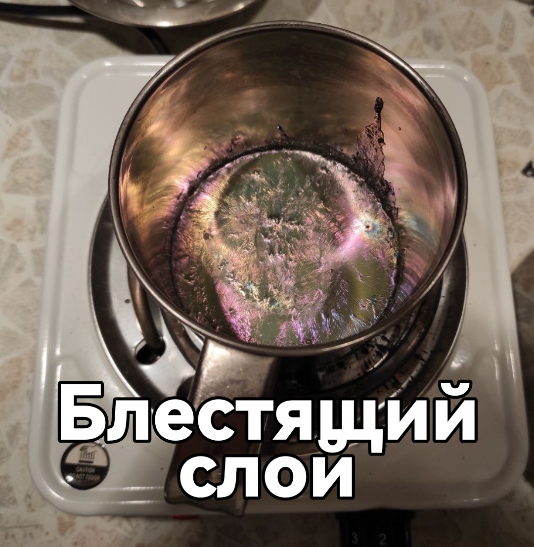 2. Образовавшийся блестящий слой нужно убрать, так как все примеси поднимутся наверх и осядут в нем. Это можно сделать, например, стальной вилкой или другим приспособлением с металлической ручкой.