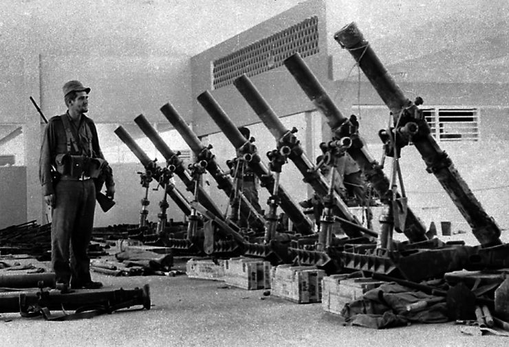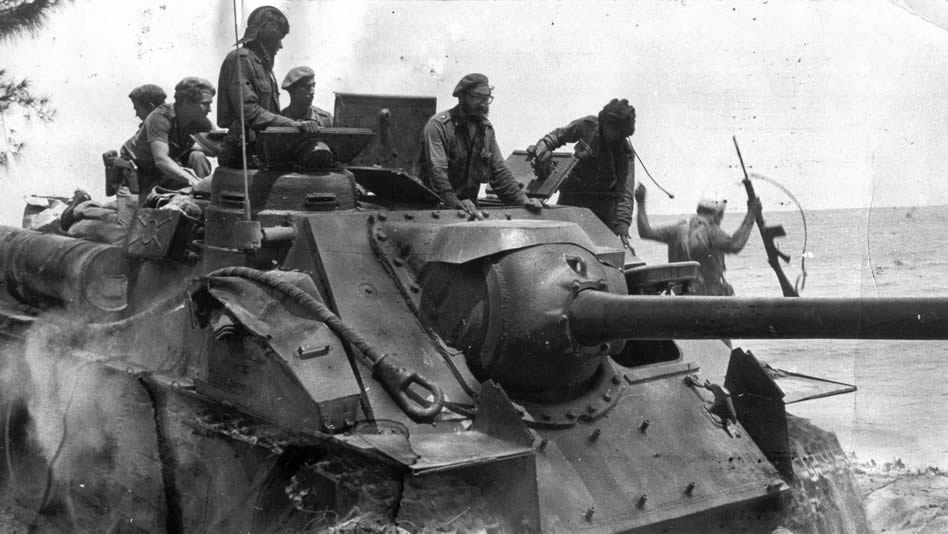Команданте Премьер-министр Кубы майор Фидель Кастро лично руководит боевыми действиями, в своем неподражаемом стиле не упуская возможности попозировать фотокорреспондентам на броне грозной техники, полученной "от друзей из Варшавского договора":