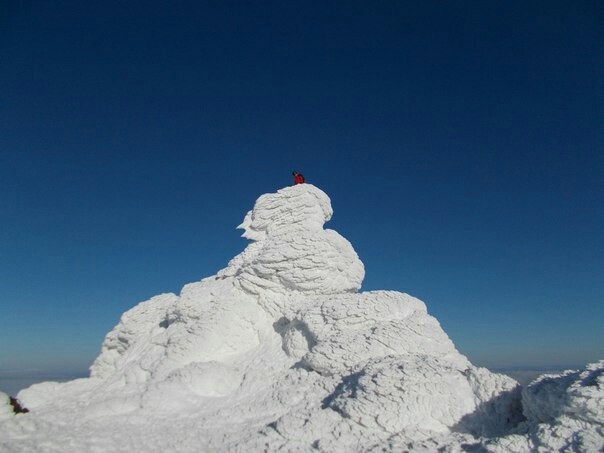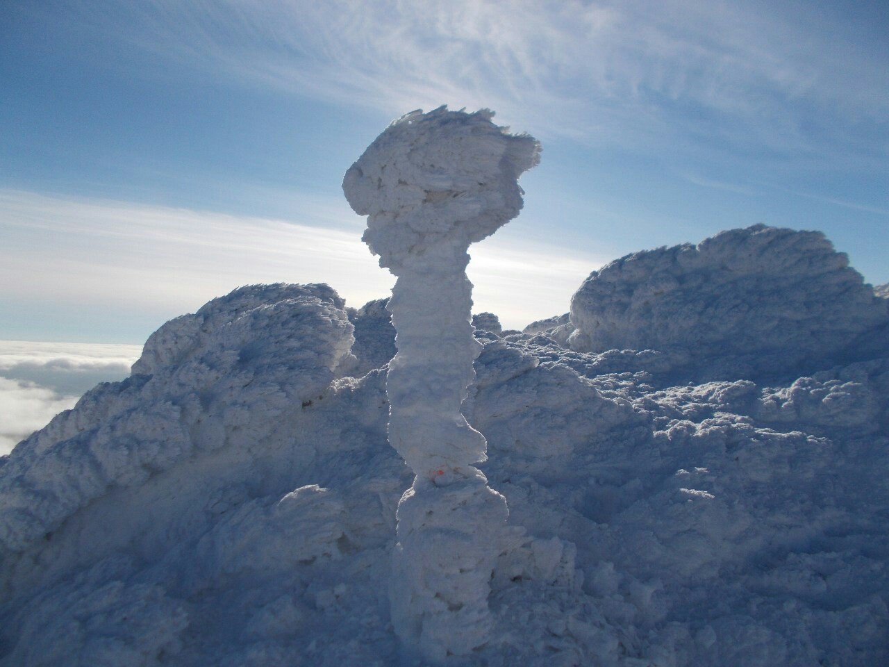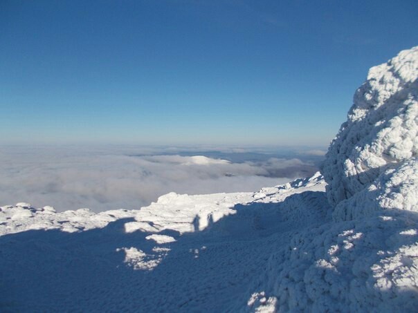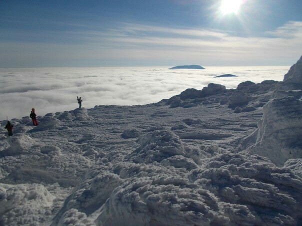 Вот мы и наверху! Отсюда видно, как Конжак поихоньку обступают облака. Вершину Конжака венчает металлический крест, но увы! Нашим взглядам предстает лишь монолитная снежная глыба. Где-то там внутри нее крест и триангуляционная пирамидка.