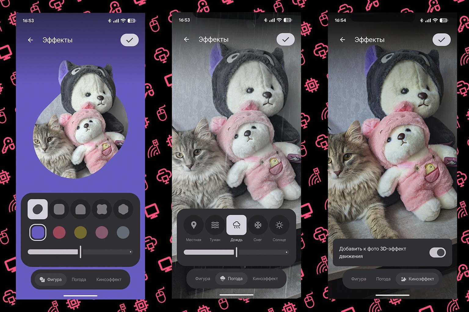 После выбора обоев можно применить одну из пяти форм и цветов, а также эффект погоды: локальный (погода как у вас в городе), туманный, дождливый, снежный или солнечный. Также можно применить кинематографическое 3D-движение. Эти функции доступны только на смартфонах Pixel.