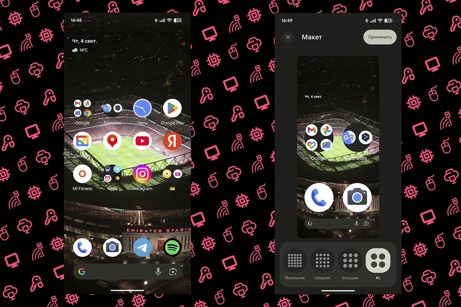 Pixel Launcher стал компактнее, освободив дополнительное пространство для иконок приложений. Появились новые варианты размера иконок: от маленького до XL. Панель поиска получила современный дизайн с градиентным логотипом «G».