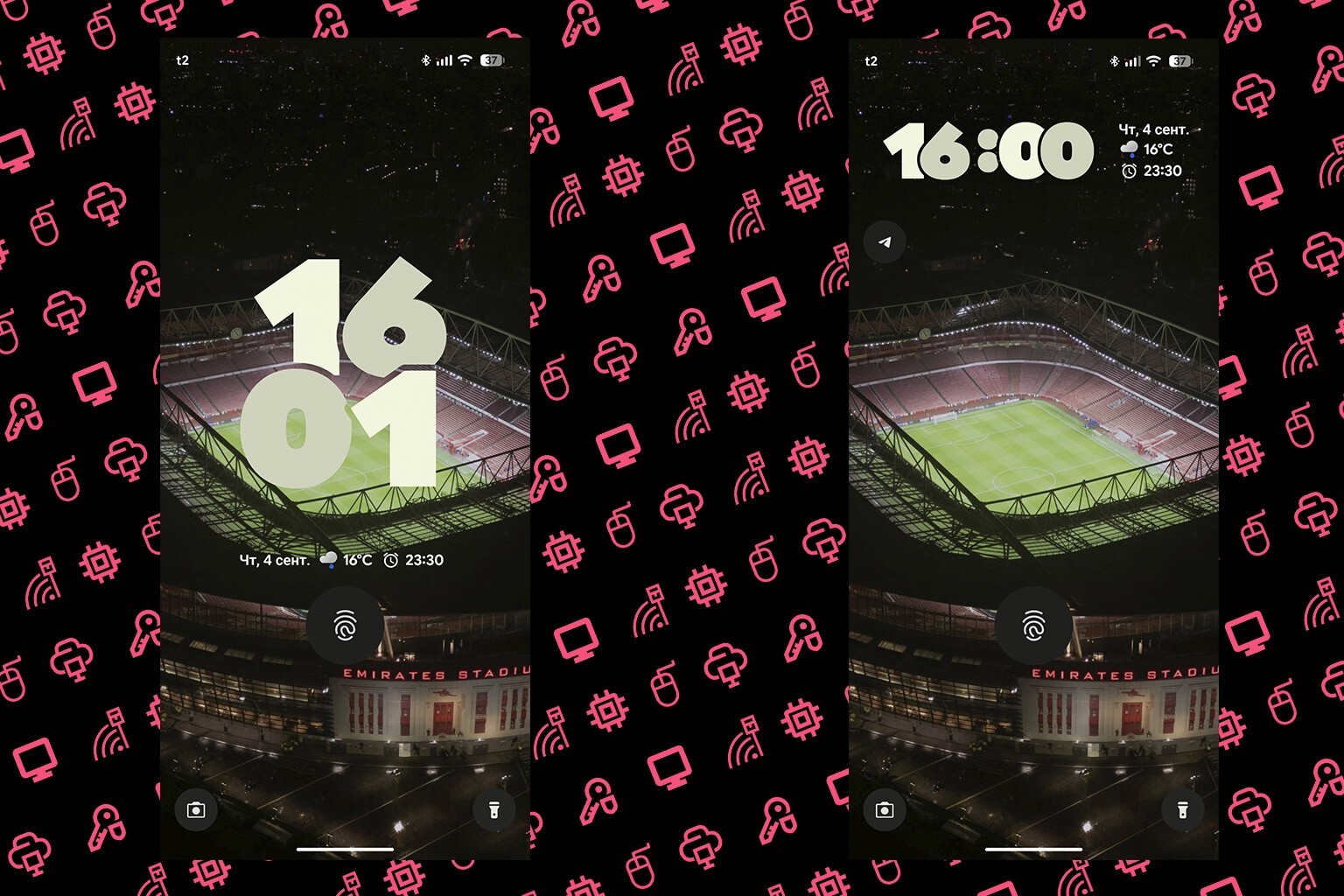 Теперь информация о дате и погоде на экране блокировки располагается под крупными часами или в правом углу при наличии уведомлений. Значки в строке состояния стали более выразительными и разделены на сегменты.